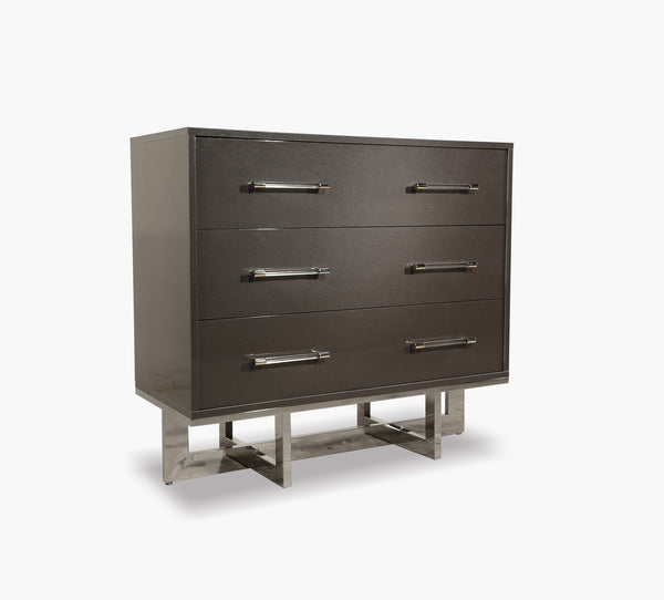 Designed for deeper storage needs, the Dante Chest features three oversized drawers with a sleek, modern profile. Finished in high-gloss graphite Italian polyester, it's accented by a nickel-plated chrome base and Lucite handles. The clean lines and spacious design offer practical elegance, keeping clutter out of sight and style front and center.