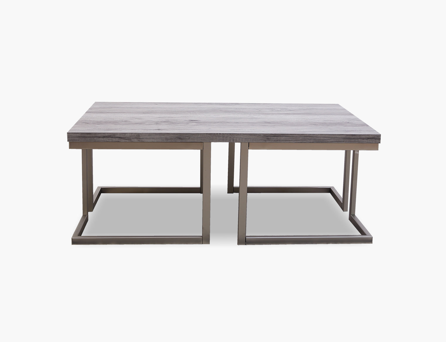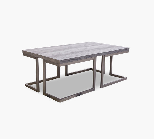 Contemporary mixed media occasional tables. Features a grey faux wood veneer top and geometric chrome legs.