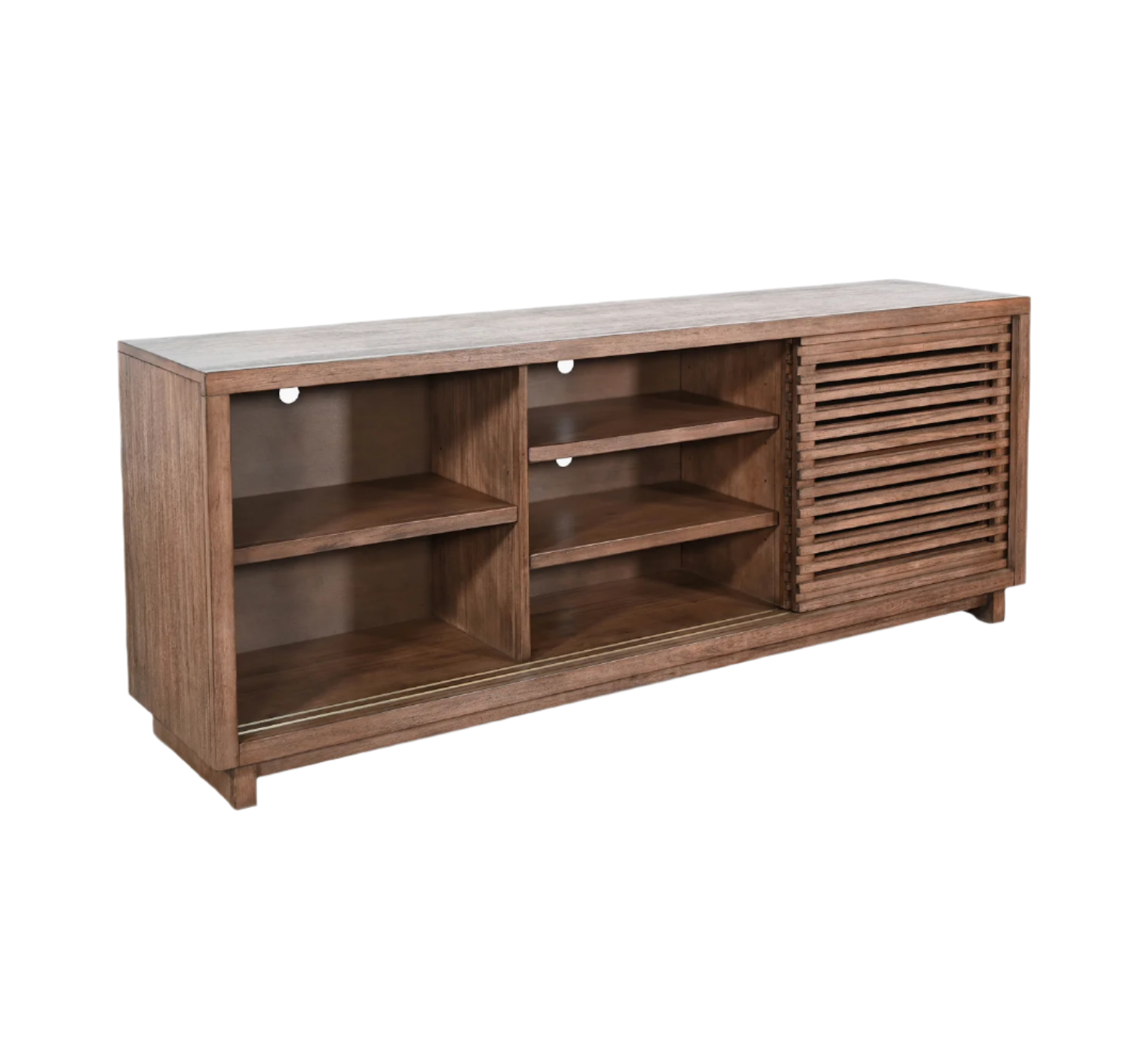 Constructed of mahogany solids and veneers in a buck skin finish. Features four adjustable wood shelves, wire management cutout and dual slatted sliding doors.