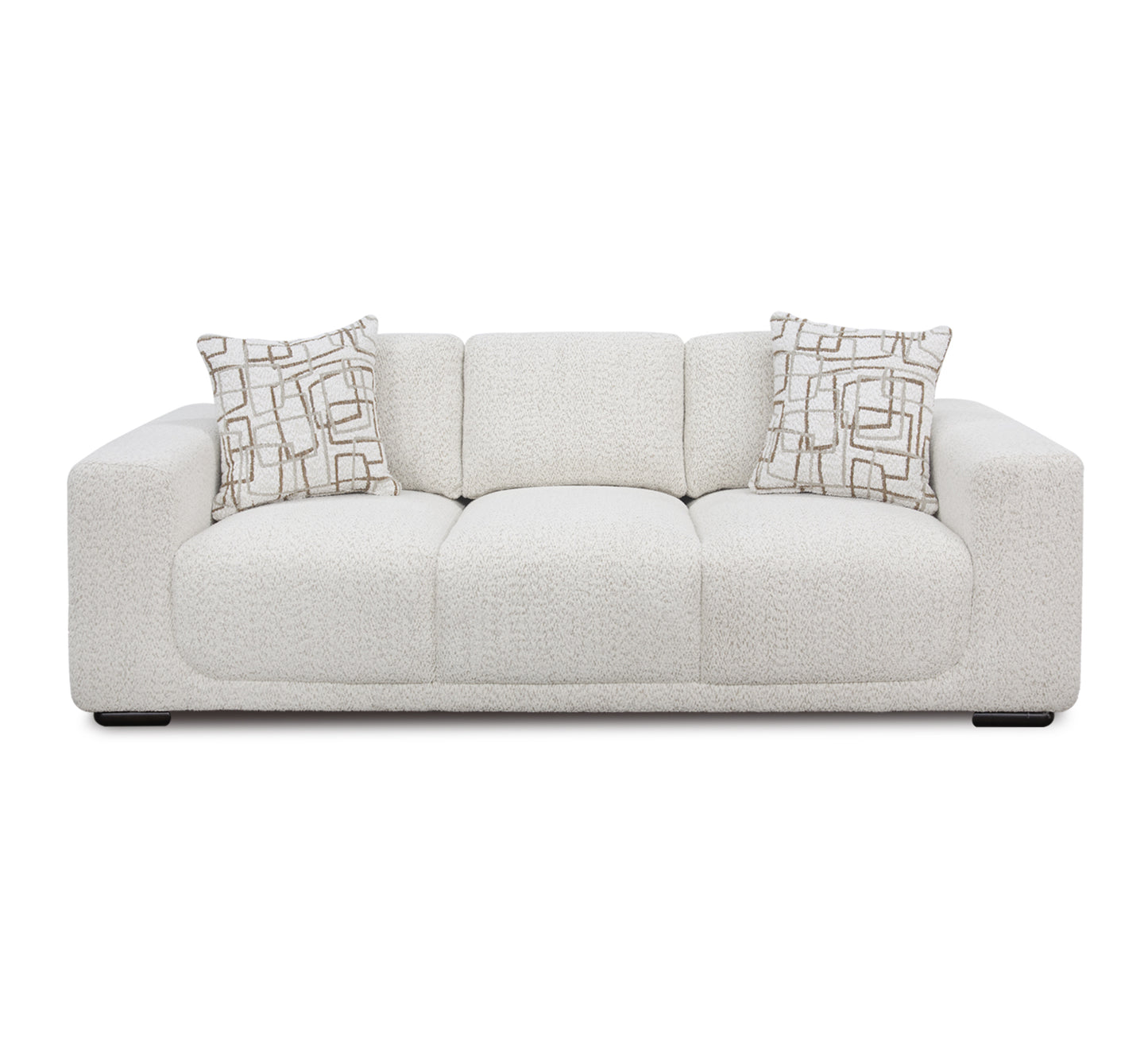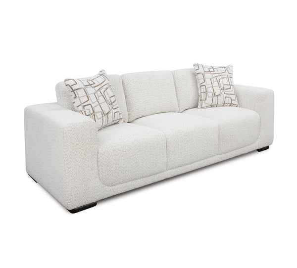 Contemporary styling upholstered in a cream, boucle fabric. Features wide track arms, loose back cushions, and walnut wood feet. Sofa includes 2 throw pillows. 100% Polyester CC: S
