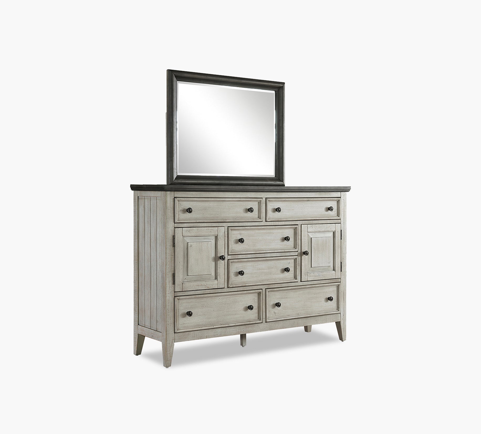 The Farm House White chesser offers a perfect blend of rustic charm and modern functionality. Finished in a weathered white with a lightly wire-brushed grey planked top crafted from pine and hardwood solids with oak and pine veneers, this piece is as durable as it is stylish. Six drawers and two doors provide versatile storage options, while pull-extension ball-bearing guides and dovetail joinery ensure smooth, long-lasting performance. Felt-lined top drawers protect your valuables, and dust-proof bottoms keep everything clean. Wire management is included for added convenience. Mirror sold separately.