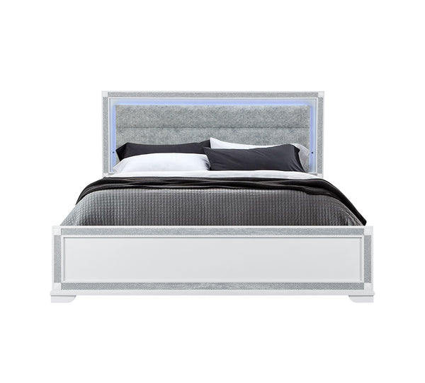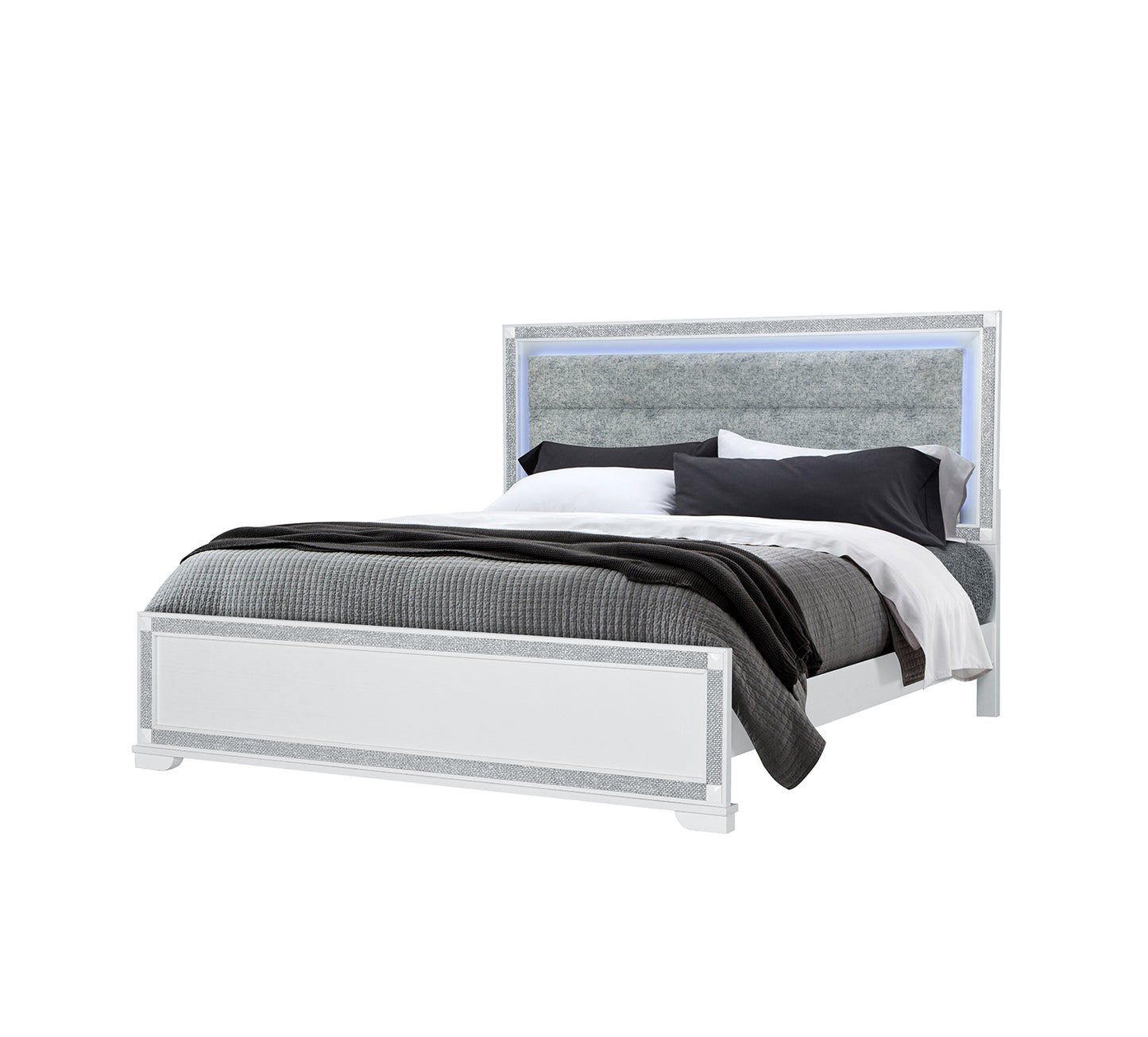 The Fergie Upholstered Lighted Panel Bed is the ultimate statement piece for a modern bedroom. Crafted from hardwood solids, it features a sleek painted white finish accented with dazzling "bling" details for a glamorous touch. The upholstered LED-lit headboard adds a layer of luxury and creates a warm, inviting ambiance, perfect for elevating your space. Upholstered in 100 percent polyester with a Cleaning Code of WS, this bed offers a weight limit of 800 pounds for lasting support and durability.