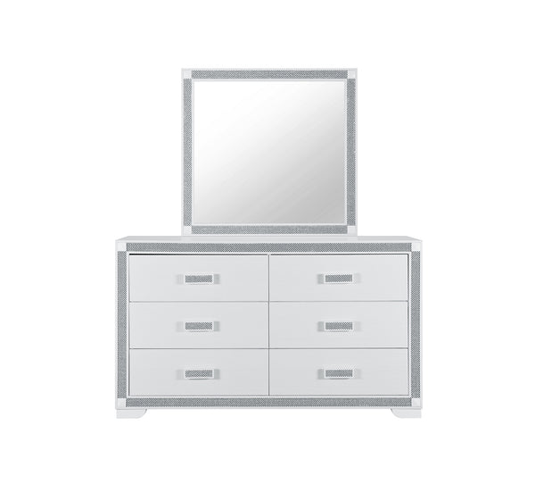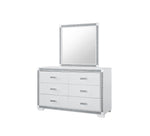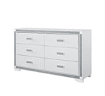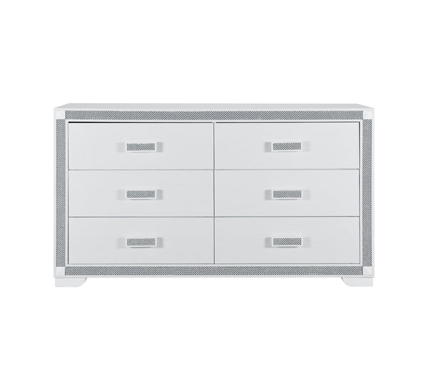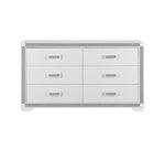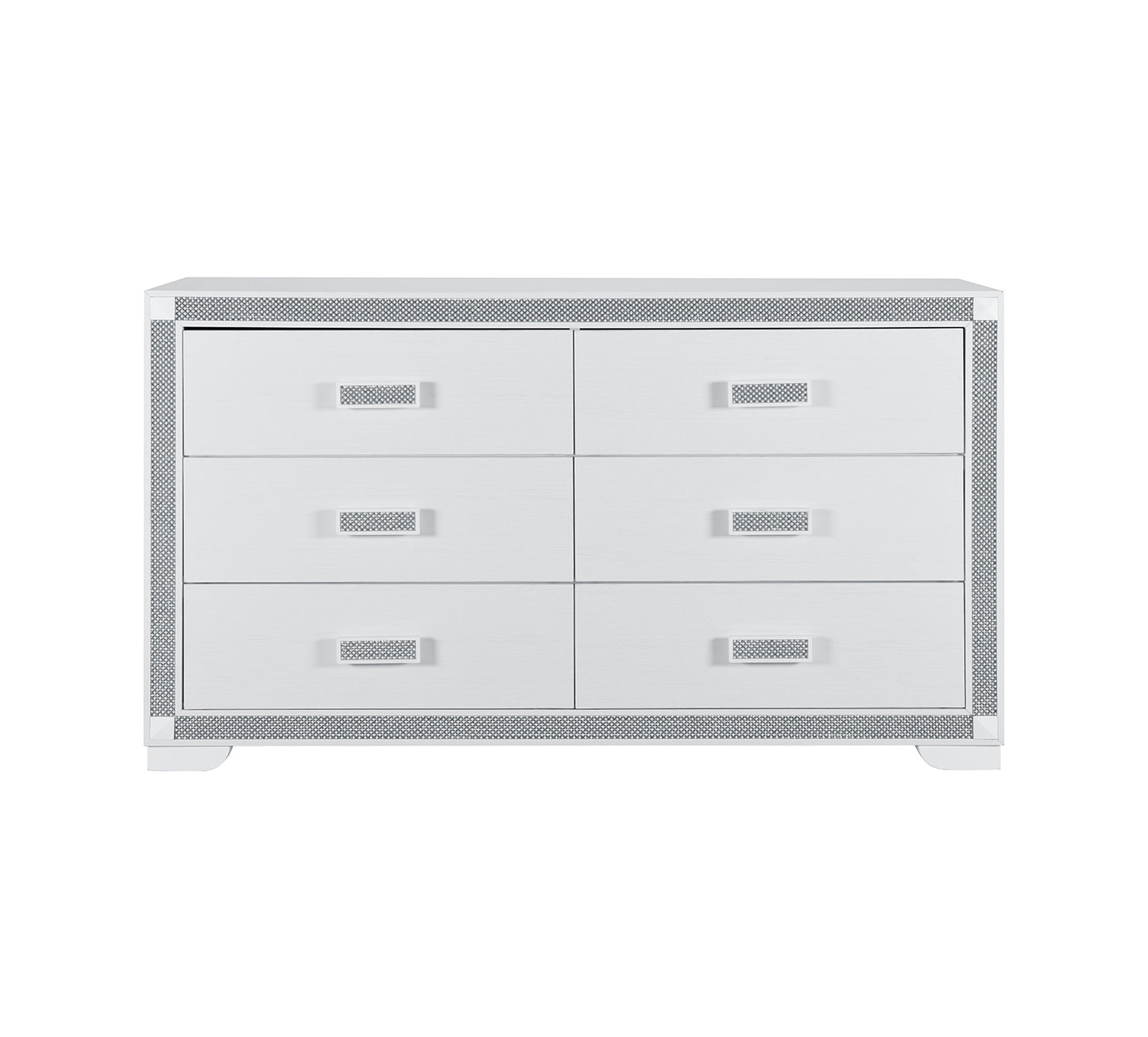 Elevate your bedroom storage with this stunning 6-drawer dresser, designed for both beauty and functionality. Each drawer features full-extension ball-bearing glides and English dovetail joinery for smooth operation and lasting durability. A dust-proof bottom keeps your belongings clean, adding a touch of sophistication. Crafted from hardwood solids, this piece boasts a rich painted white finish accented with dazzling "bling" details for a glamorous look. Mirror not included.