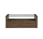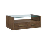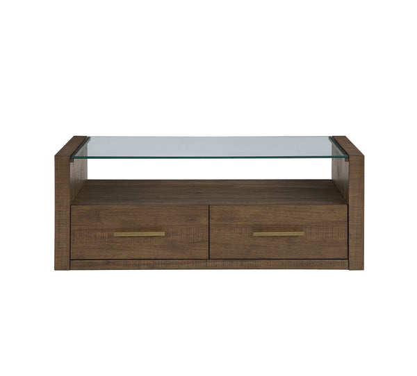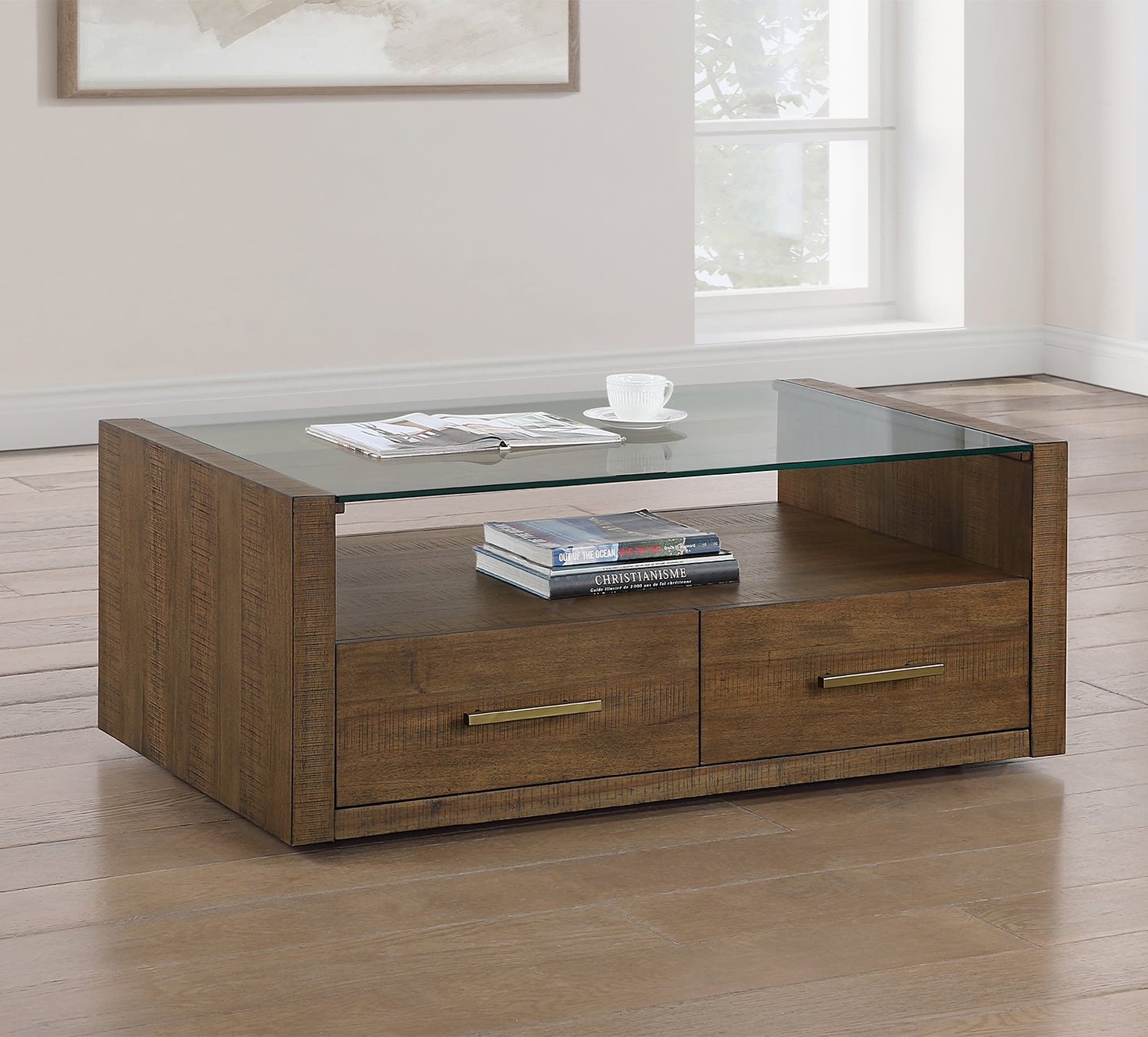 The Garland cocktail table combines modern design with rustic appeal. Its sleek lines and distressing in a rich toffee finish make it a striking centerpiece. The clear glass top provides a beautiful surface for display, while two drawers offer practical storage for everyday items. Equipped with hidden casters, the table is easy to move for cleaning or to create more space when needed. Stylish and functional, this cocktail table is a perfect addition to any home.