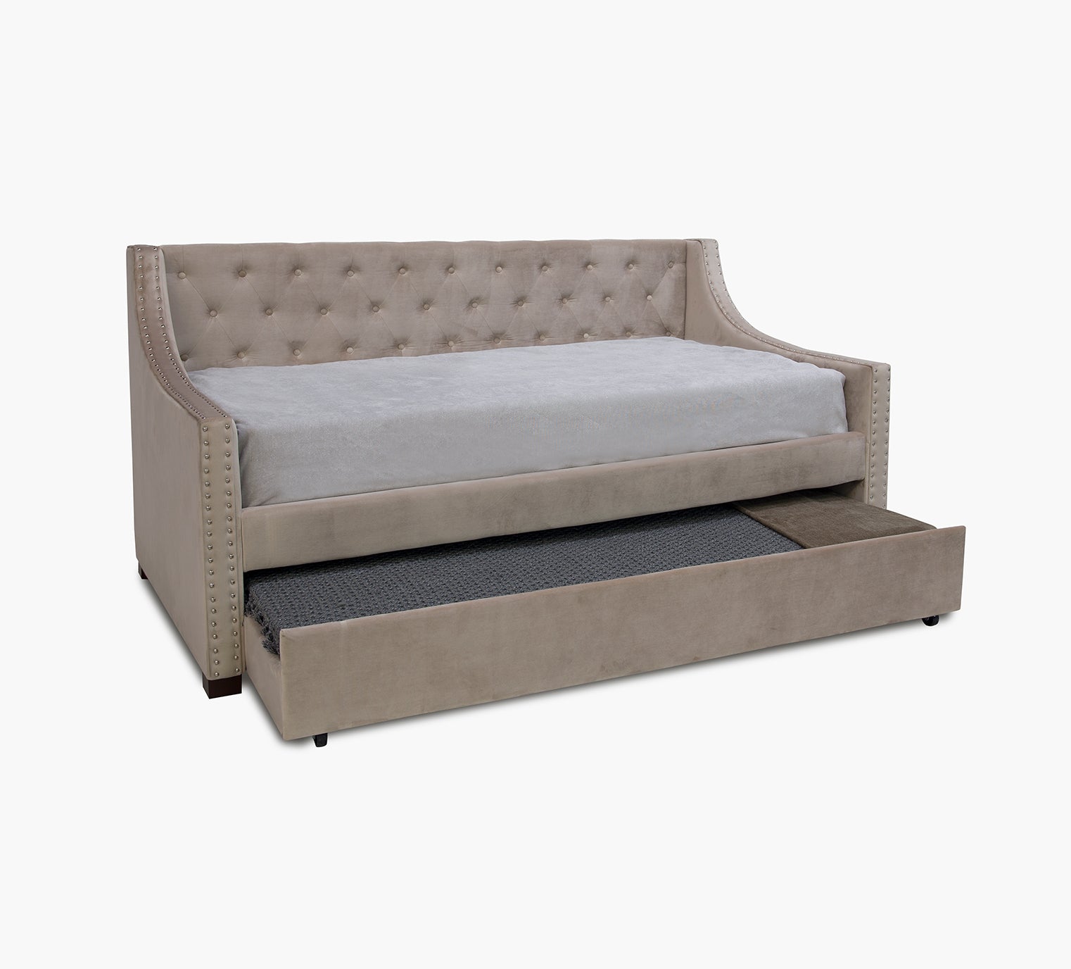 Elegant twin size daybed upholstered in champagne fabric. Features a tufted back and nailhead trim on the arms. The pull out trundle is on casters and can hold up to a 7"" twin size mattress. Fabric 100% polyester. Cleaning code WS."