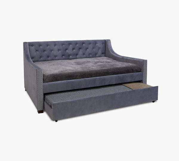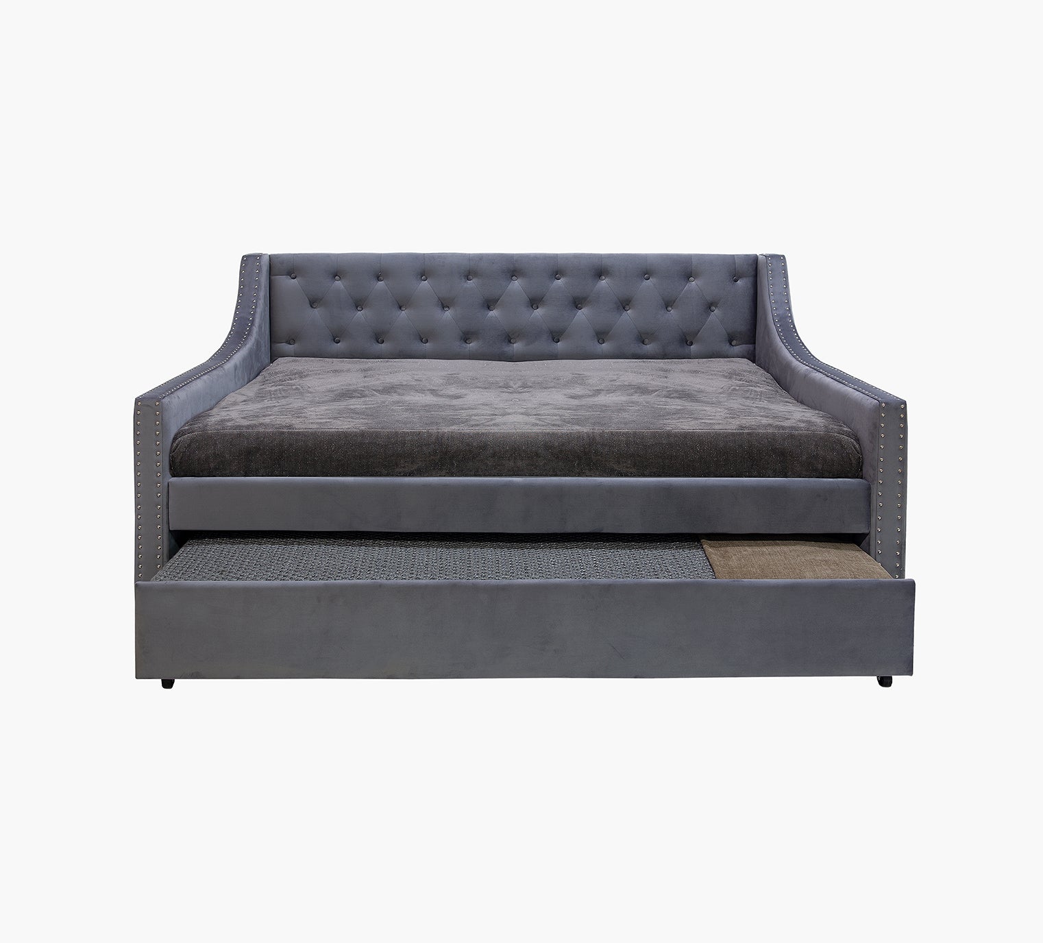 Elegant full size daybed upholstered in charcoal fabric. Features a tufted back and nailhead trim on the arms. The pull out trundle is on casters and can hold up to a 7"" twin size mattress. Fabric 100% polyester. Cleaning code WS."