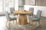 Crafted from hardwood solids and white oak veneers in a soft blanched oak finish, this dining table features a striking round reeded pedestal base that adds texture and visual interest to your space. Matching upholstered side chairs complete the set, offering comfort with 100% polyester fabric and a cleaning code of X for easy care. Each chair is designed for durability with a weight capacity of 300 lbs, making this set both stylish and practical for everyday dining.