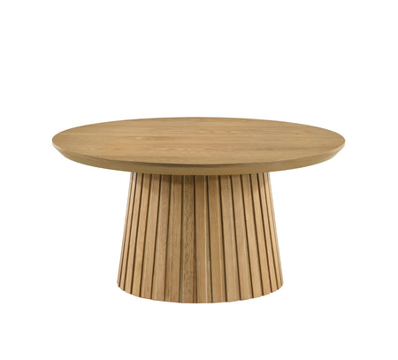 The Holt Natural end table adds a striking touch to both contemporary and classic interiors. Featuring a unique vertical fluted base and a sleek round top, it blends elegance with modern style. Crafted from solid wood and white oak veneer in a natural finish. It seamlessly fits a variety of decor styles.
