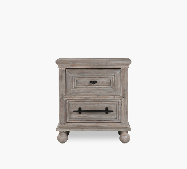 The Hyde Park Dark nightstand is finished in a warm brown wire brushed texture and crafted from Acacia solids and Acacia veneers for lasting durability. It features traditional deep mitered molding, recessed panels, and classic wooden ball feet for a timeless look. Nautical inspired accents include black nickel knob and bar hardware styled after boat cleats. The top drawer is felt lined for added protection and refinement.