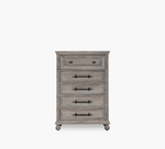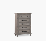 The Hyde Park Dark chest is finished in a warm brown wire brushed texture and crafted from Acacia solids and Acacia veneers for lasting durability. It features traditional deep mitered molding, recessed panels, and classic wooden ball feet that bring timeless elegance. Nautical inspired details include black nickel knob and bar hardware styled after boat cleats. The top drawer is felt lined for added protection and refinement.