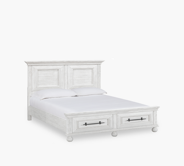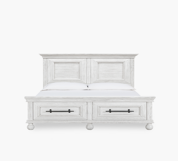 The Hyde Park Light Queen Storage Bed features a double framed headboard and footboard accented with traditional deep mitered molding, recessed panels, and classic wooden ball feet. Crafted from Acacia solids and Acacia veneers, it is finished in a wire brushed white texture that highlights the natural beauty of the wood. Built for convenience, the storage base offers extra space while maintaining a refined look. All Hyde Park Light beds are designed for both style and durability, supporting up to 500 pounds.