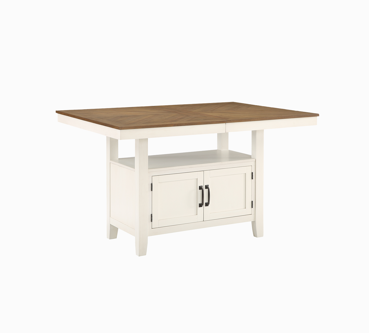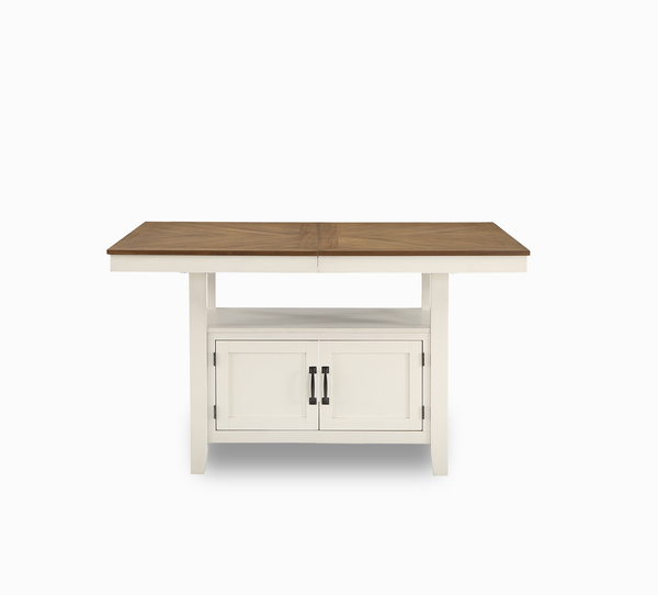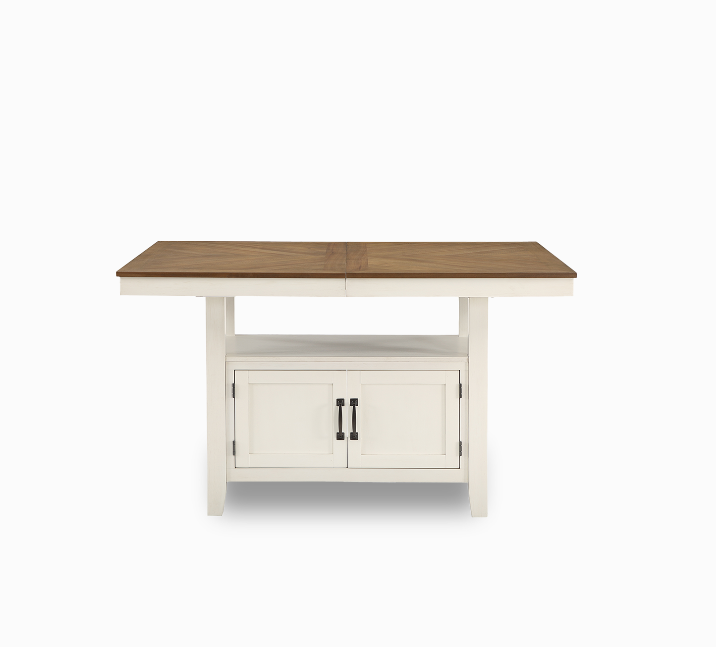 Bring relaxed transitional style to your space with this counter-height table, finished in a warm two-tone Milk and Honey palette. Crafted from Acacia and Asian hardwood solids with Acacia veneers and engineered woods, it features a striking chevron-patterned top enhanced by wire-brush distressing for added character. The sturdy base includes two-door hidden storage and an interior shelf, perfect for keeping essentials close at hand. Extending to 80" with a 20" leaf, this versatile piece combines beauty and functionality, complemented by oil-rubbed nickel hardware for a refined touch.