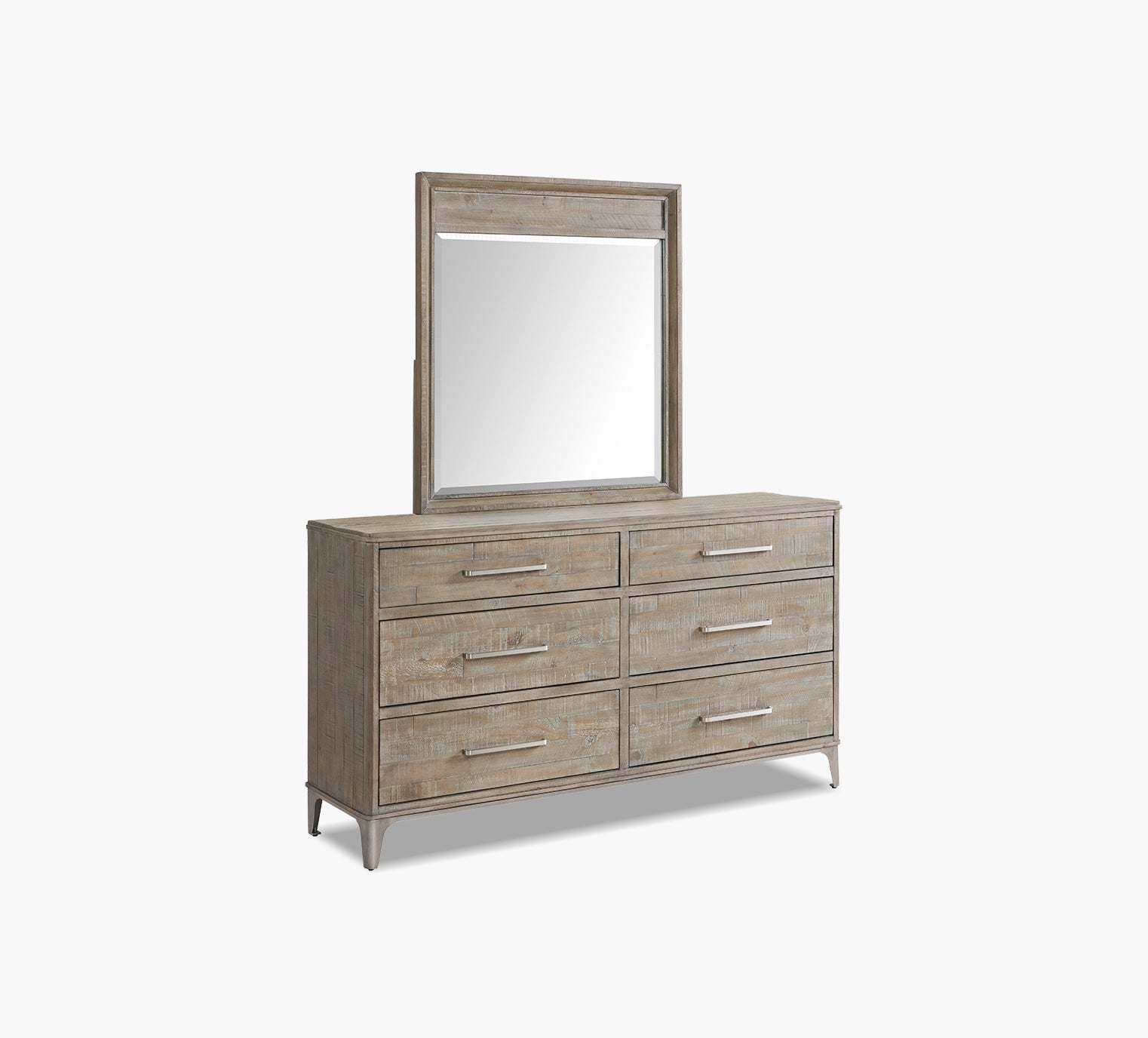 The Intrigue dresser combines rustic character with practical design. Made from solid pine, this six drawer dresser features authentic distressing and saw marks in a Hazelwood finish that blends taupe and gray earth tones. Metal hardware and feet add a clean accent. Each drawer is built with full extension ball bearing guides and dovetail joinery for smooth and sturdy use. The top drawers are felt lined for delicate items and the bottom drawers are cedar lined to keep clothing fresh. A dustproof bottom helps protect your belongings. Mirror sold separately.