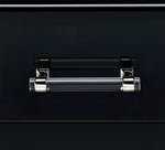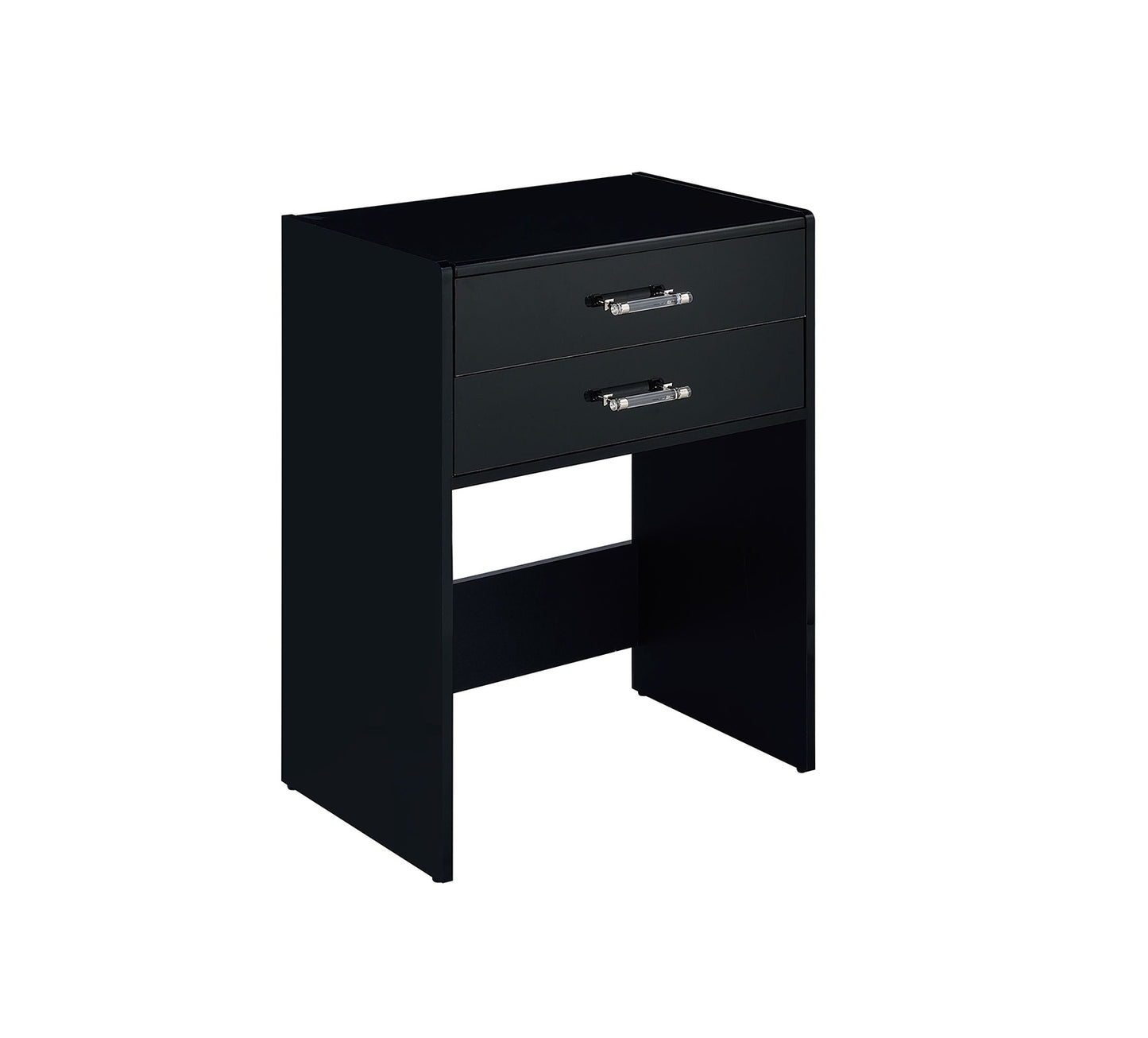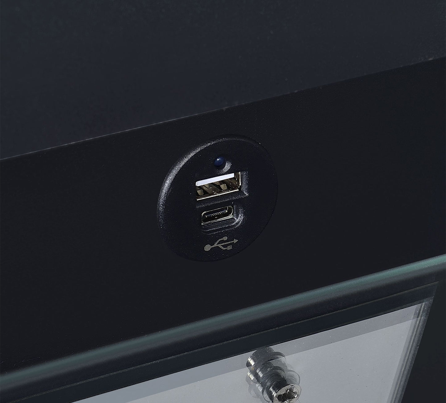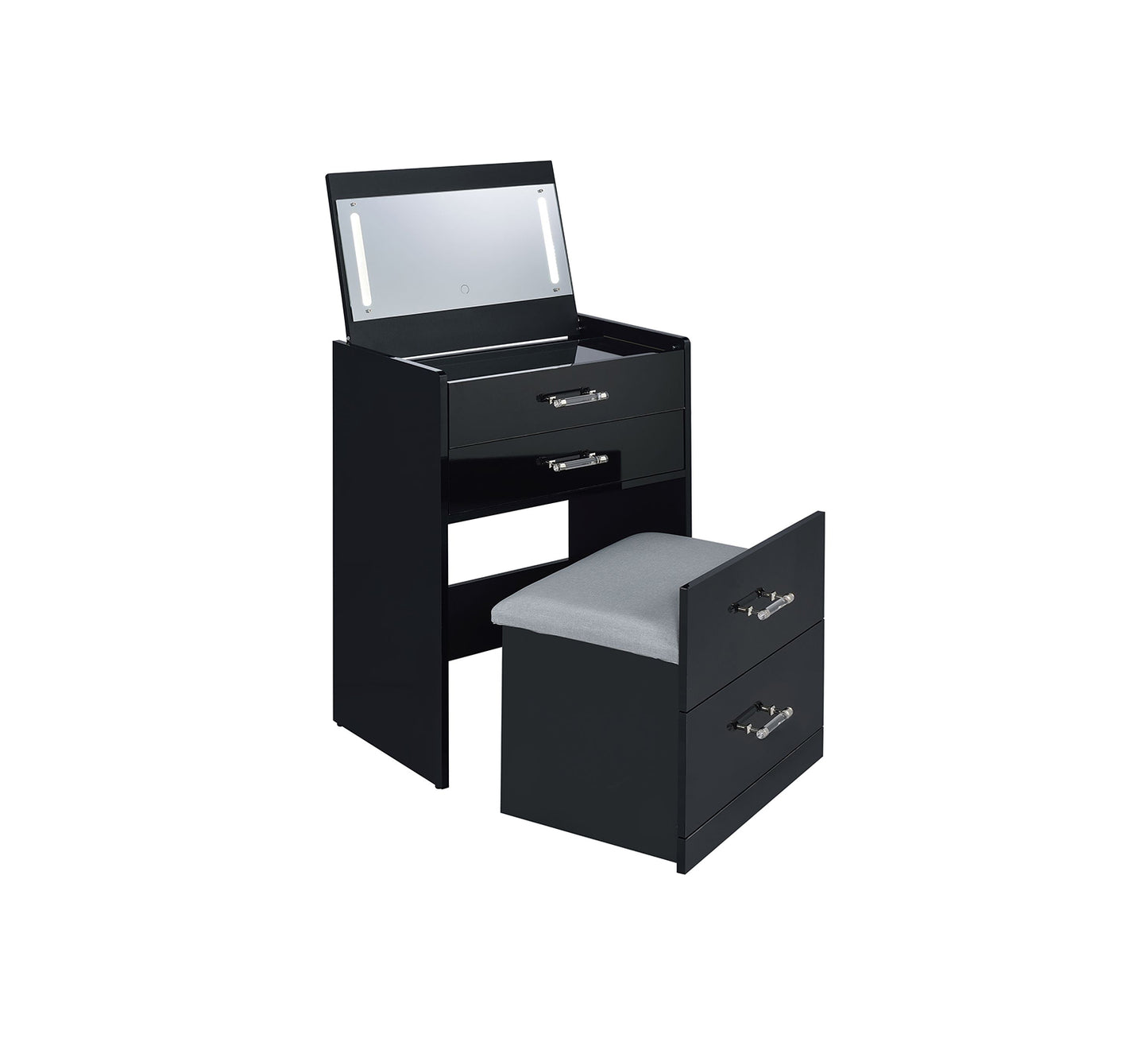 The Irvine Mini Vanity combines style and function with a glossy finish, touch activated LED lighting and USB-A & C ports. Features a hidden space-saving stool with a built in drawer, two upper drawers, one felt-lined for valuables, stylish Lucite handles and a durable tempered glass shelf with a soft closing lift top lid.