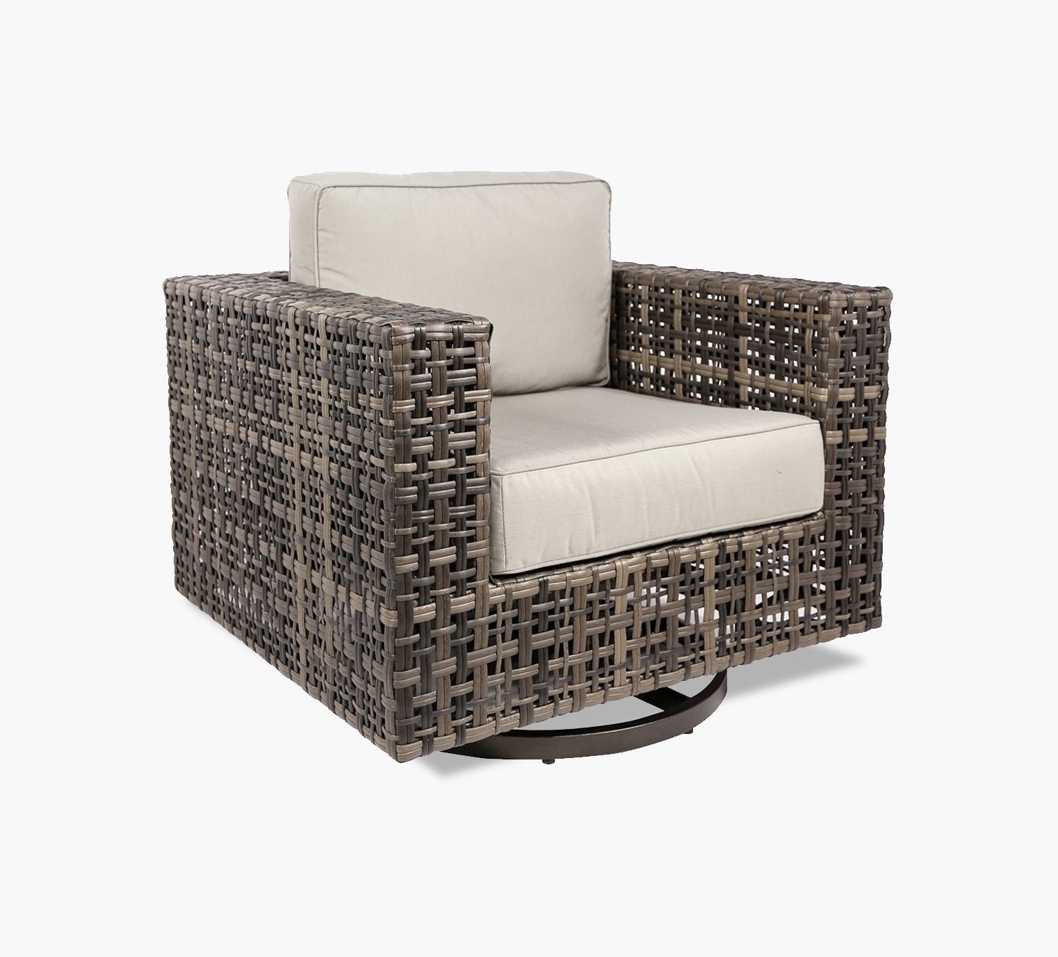 The Kona Kai outdoor swivel lounge glider is a an artistic addition to your backyard or patio! You will be able to look around and relax with the smooth swivel base. The cube shape is constructed of a strong wicker with various brown colors which create a unique look. The beautiful and comfortable cushions are durable and well suited for years of backyard relaxing!