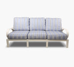 Bring the Nantucket vibe to your backyard with the Mariner outdoor sofa. The casual coastal design in nautical stripe Sunbrella upholstery has a crisp white powder coat finish aluminum frame for a light feeling that will transport you away. The generous three seat design with X back and graceful scroll arms. Matching 84"" rectangular dining set also available to complete your outdoor space."