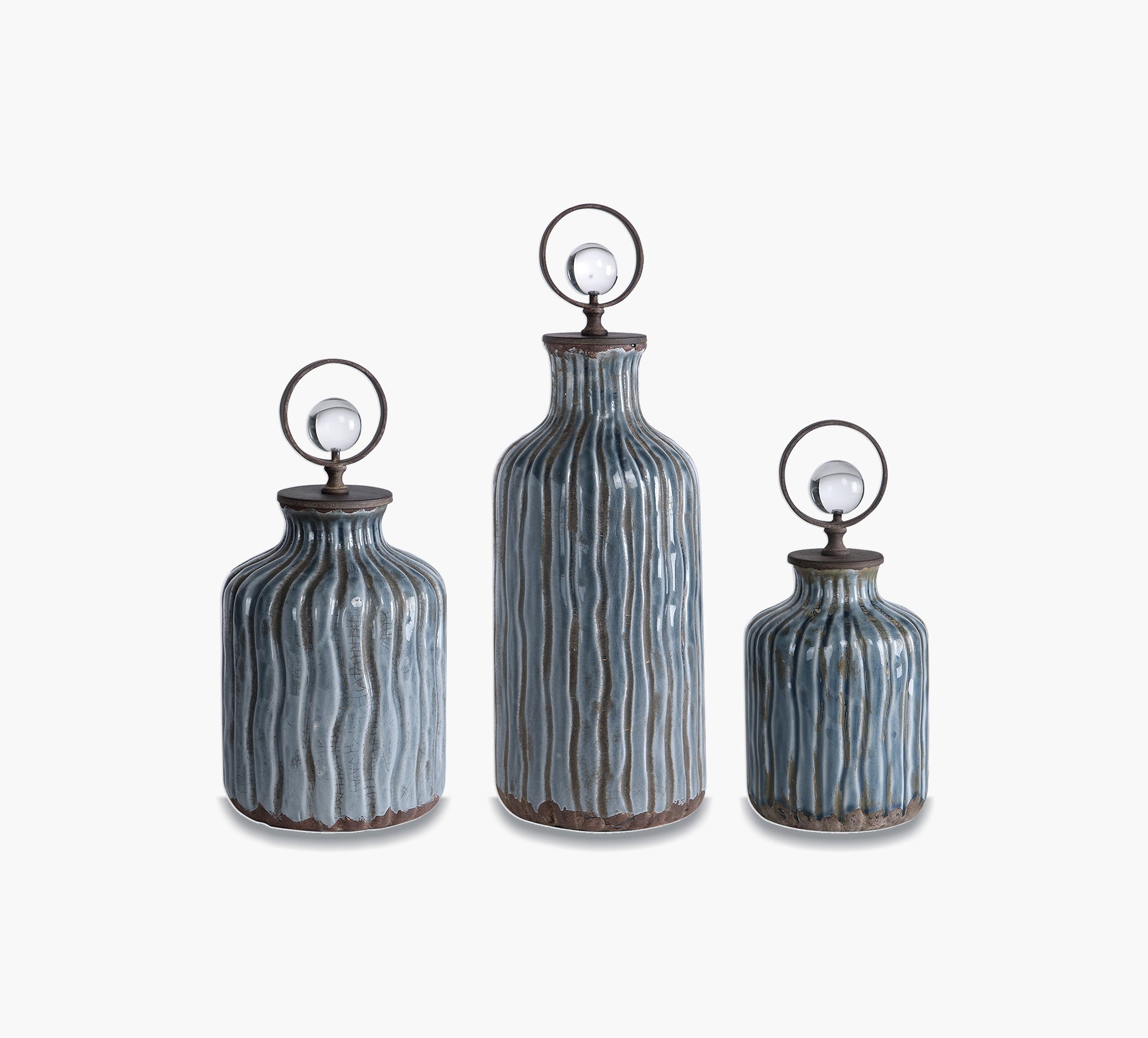 Hand fluted ceramic bottles in a grey-blue glaze topped with weathered bronze metal finials with matching crystal sphere accents.