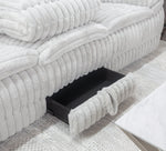 Contemporary three over three styling upholstered in a light grey, wide wale corduroy fabric. Includes a hidden storage drawer and a drop-down table with cupholders. 100% Polyester CC: W