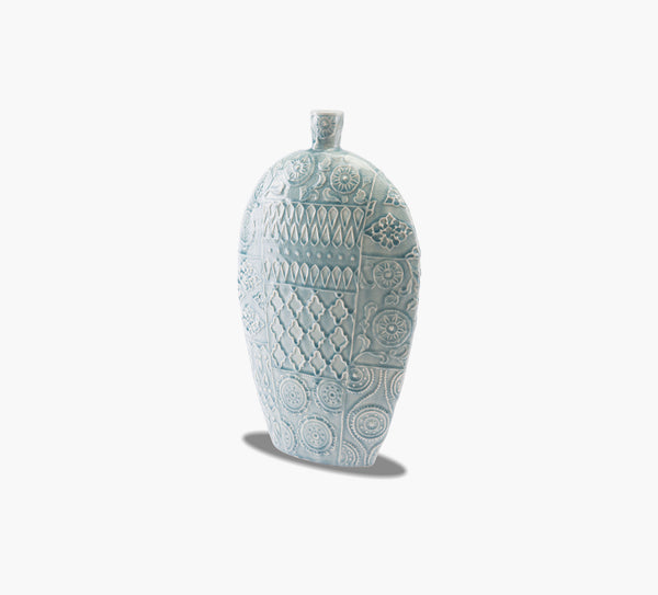 A Moroccan influence is what gives this gorgeous vase so much personality. Its pattern and texture is visible from all angles and is a stand out in lovely soft blue. Display it on a vanity, accent table or mantle as an artistic element. Pair it with its matching smaller vases for visual balance and impact.