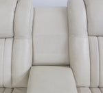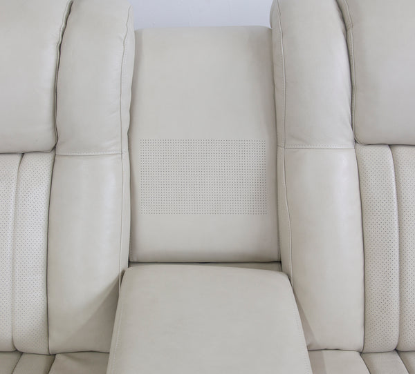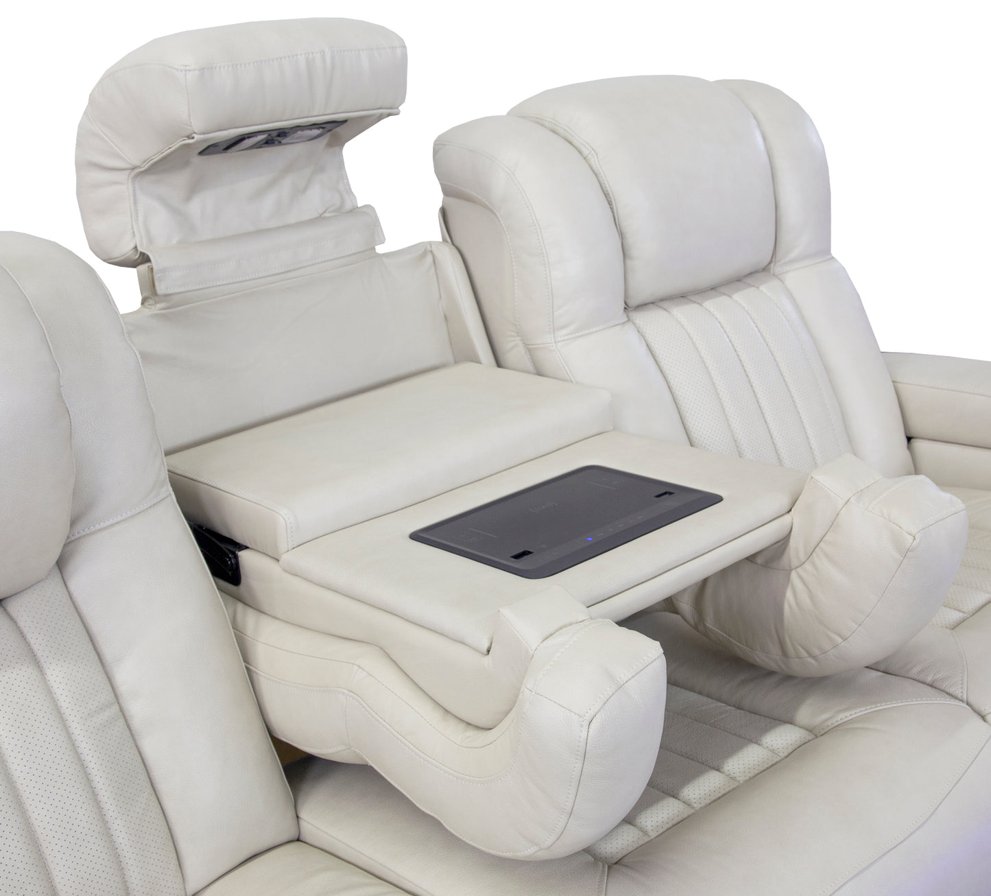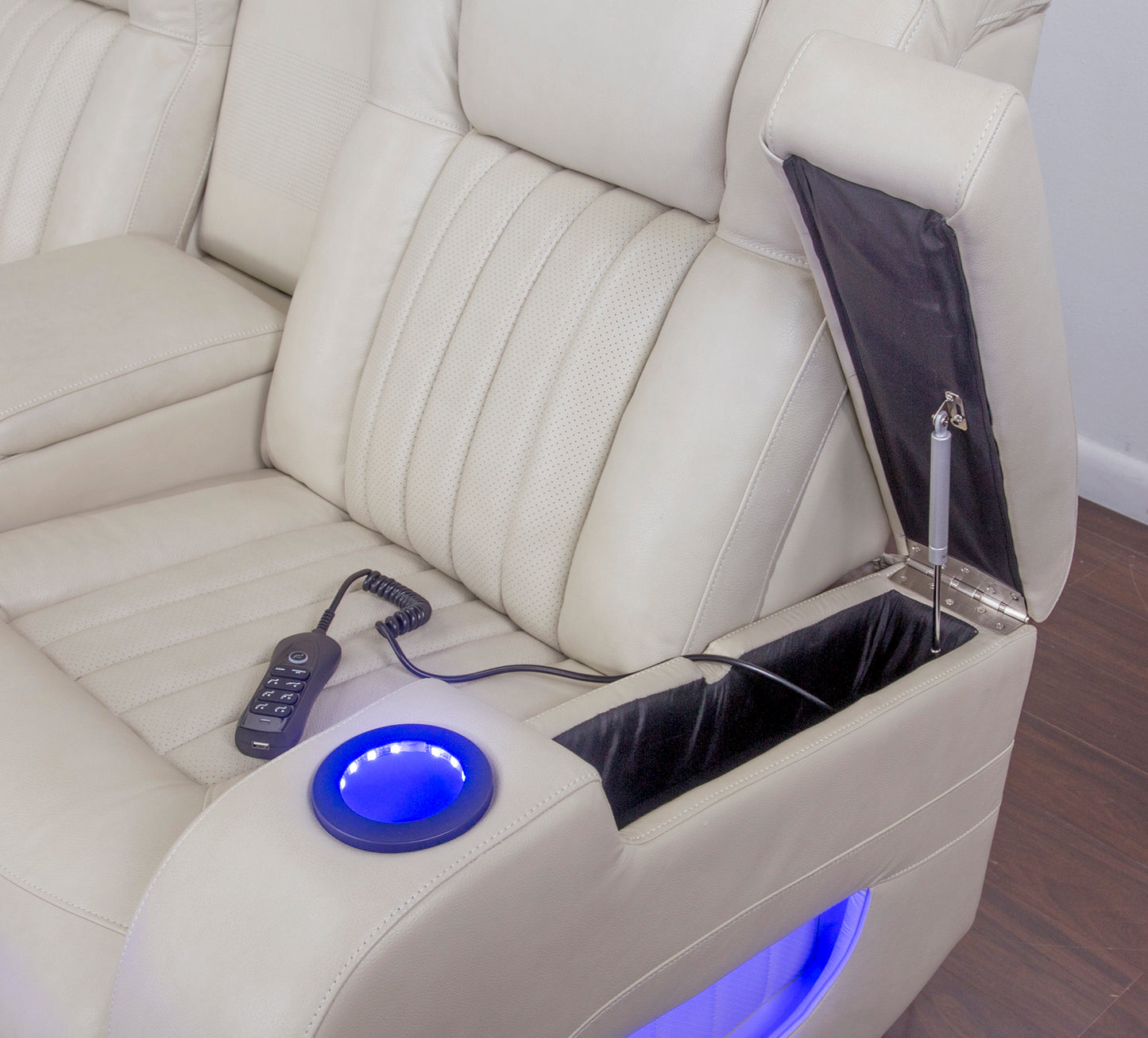 Top grain leather everywhere you sit matched with vinyl. High-quality leather features automotive channeled styling and perforated seat detail in a neutral pearl color. Triple power motors in each recliner offer power recline, power headrests, and power lumbar. Includes four-bladder air massage with heat and three pre-programmed massage settings. Features color-changing lights in the base rails, cupholders, and side storage cutouts. Sofa and loveseat include audio tables with bass vibration, immersive sound, and wireless charging. Sofa also includes a drop down table with independently controlled reading lights. Hidden USB and USB-C charging ports are included in the control panels. Control wands include a USB port and can be stored in a hidden compartment in the armrest. To change the color of the cupholder and base rail lights, press and hold the silver button on the inside of the arm. Release the button once you get to the color of your choice.