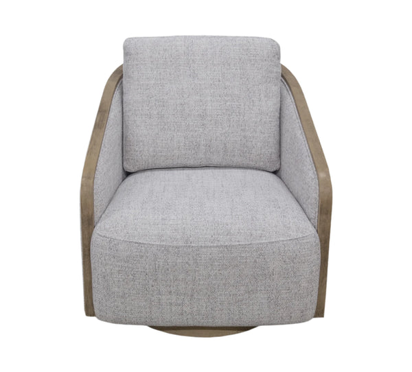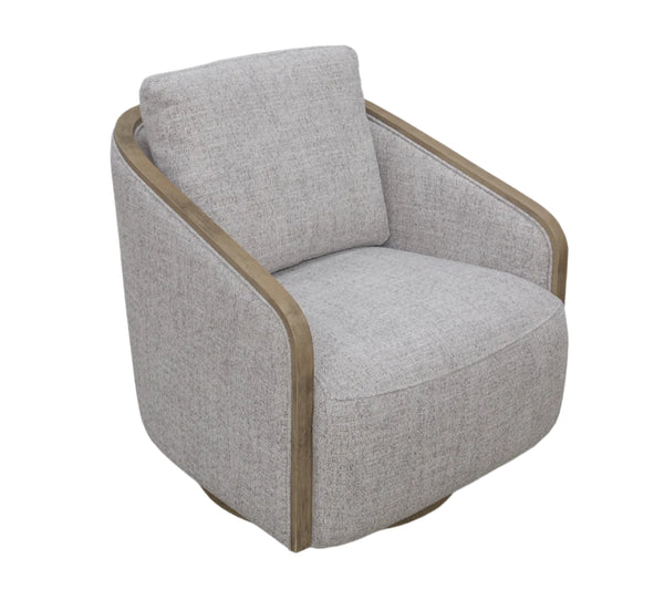 100% Polyester CC: W Contemporary swivel chair upholstered in a textured light grey polyester with wood trim. Features removable lumbar pillow, 360 degree swivel, and a wood base.