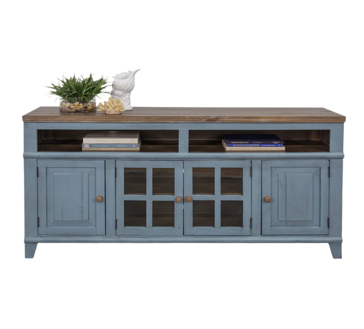 Traditional blue 80"" TV console constructed of solid wood in two tone finish.Features compartments,glass doors and wire management access.Accommodates most flat screen TVs up to 90"" and 80 lbs."