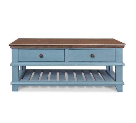 Farmhouse style constructed of solid pine in a soft blue finish with a distressed brown top and Knobs. Bottom shelf and drawer offer display or storage.