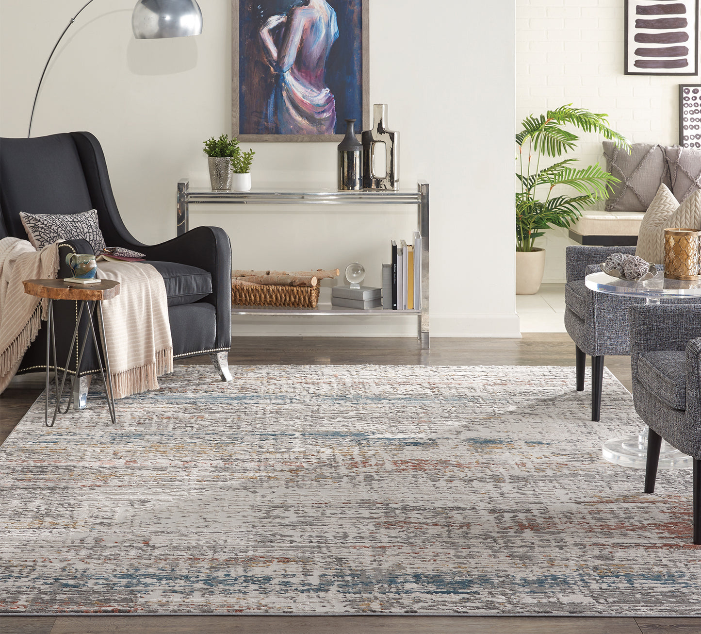Warm earth tone colors are treated to a dramatic textural process that gives this cut pile Rustic Textures area rug a unique look of natural, weathered beauty. Artistic and painterly, it is an exciting choice to complement your contemporary or eclectic decor. Ideal for the modern lifestyle with serged edge and low-shed, easy care fibers.