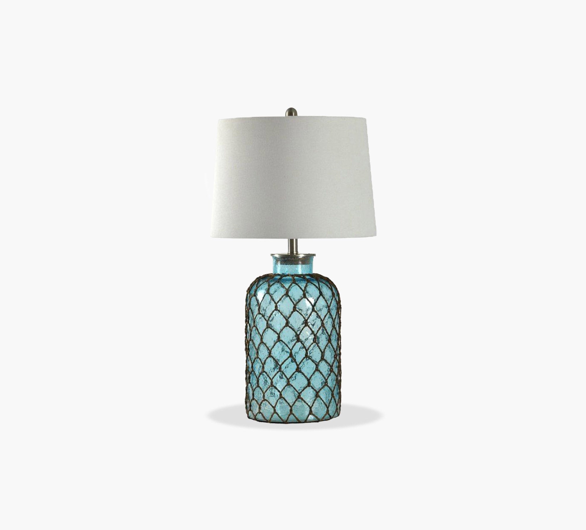 Set a relaxing coastal mood in any room with the Montego Bay table lamp. The design features a transparent blue glass bottle vase accented by rope netting.