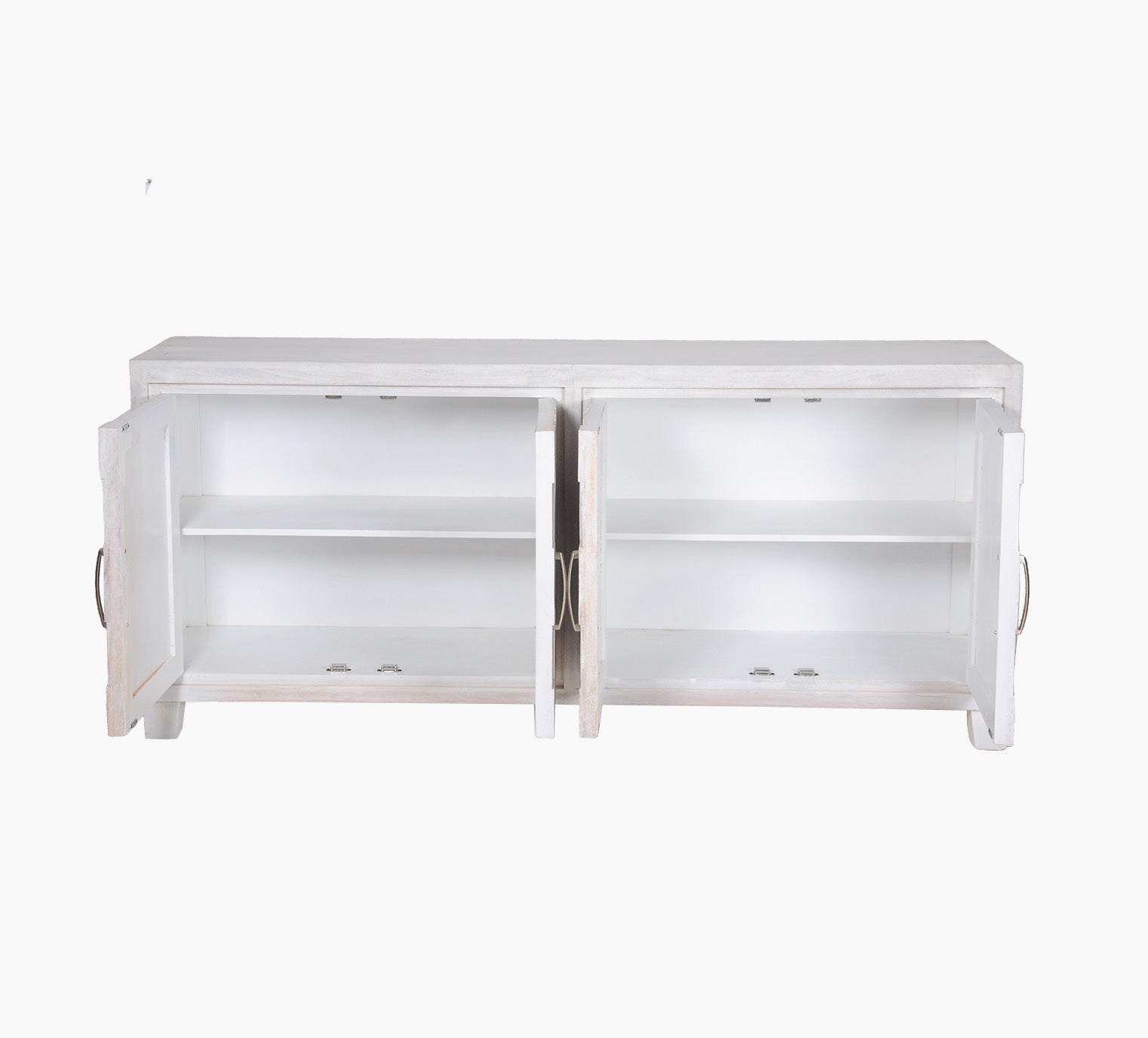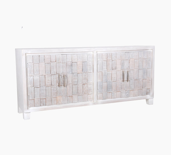 This handsome sideboard/cabinet is constructed of solid mango wood in a whitewash finish. The cabinet doors are accented in various shapes and sizes,giving the impression of old brick or stone. Attractive door pulls in a chrome finish complete the package.