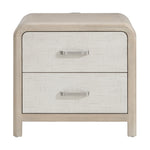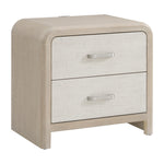 The Mykonos two drawer nightstand combines style and function for a beautifully balanced design. Crafted from solid hardwoods and quarter cut oak veneers, it features a wire brushed sand finish that adds warmth and texture to your bedroom. Brushed nickel drawer pulls offer a sleek accent while ball bearing side mounted guides and dovetail joinery ensure smooth and lasting performance. Each drawer front is wrapped in embossed linen for a refined contrast, and built in USB charging makes it easy to keep your devices powered and close at hand.