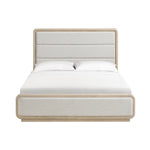 The Mykonos queen upholstered panel bed brings coastal elegance and lasting comfort to your bedroom. Crafted from solid hardwoods and quarter cut oak veneers, it features a wire brushed sand finish that adds warmth and texture. The upholstered headboard is wrapped in 100 percent polyester fabric with a WS cleaning code for durability and easy care. Designed for strength and stability, this queen bed supports up to 500 lbs, making it as practical as it is beautiful.