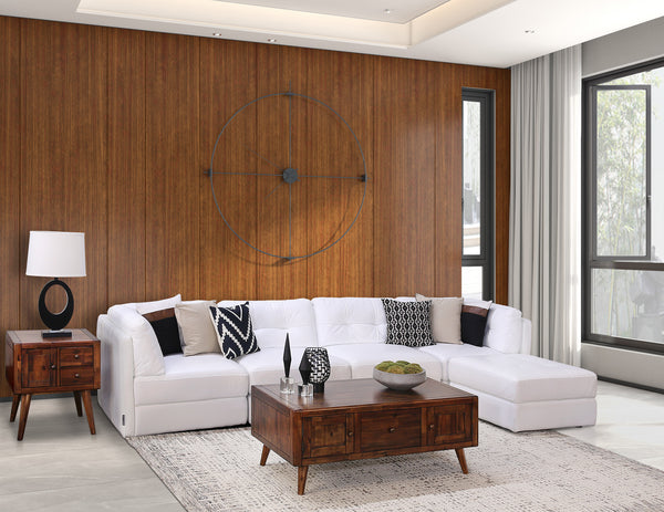 The Oakley 5 piece sectional sofa consists of 2 armless chairs, 2 corner chairs, and an ottoman. Contemporary styled modular leather sectional that will work into any lifestyle. This collection can be tailored to fit any living area. Features tufted back design and box seats, rubber grippers on each leg help keep the pieces uniform and in place. Three pieces make it easy to customize for you space and budget. Stocked in white and grey.