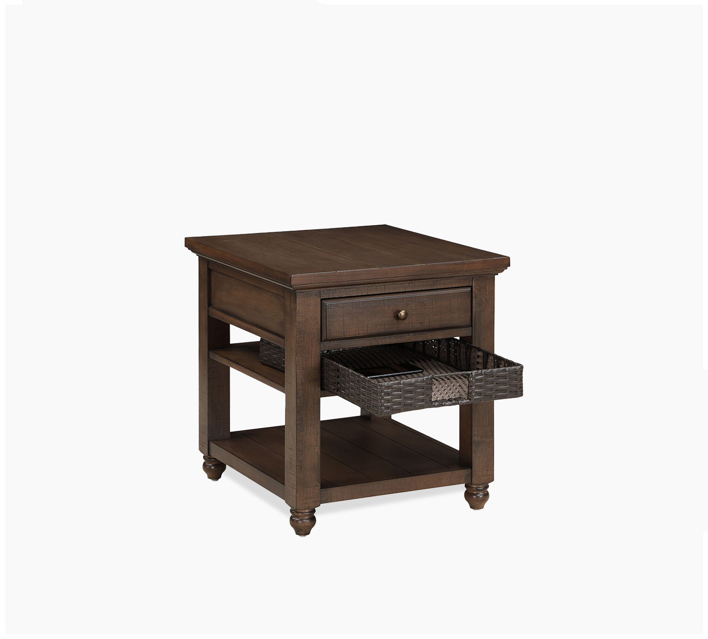 Tropical styling in acacia veneers, hardwood solids, and engineered wood. Styling details include 1 removable rattan basket, 1 drawer, plank tops, and picture frame ends. A burnished brass-toned knob adds a touch of color to the front of the piece.