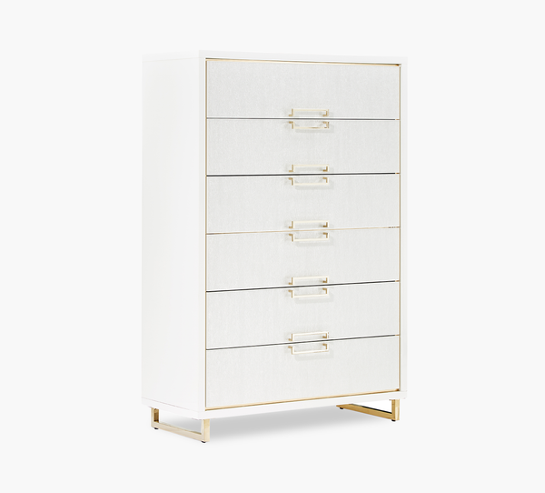 The Palm Gate chest offers a sleek and sophisticated design with its glossy cloud white acrylic finish and lustrous gold accents. Each drawer front showcases a subtle wood grain pattern and distinctive rectangular pulls for a modern touch. Velvet-lined drawers glide effortlessly and feature self-closing mechanisms for convenience and durability. This piece pairs beautifully with the entire Palm Gate collection, creating a refined and inviting bedroom retreat.