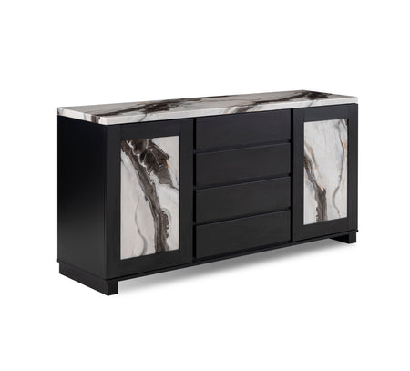 The Panda dining collection brings a perfect blend of luxury and durability to your home. Featuring a stunning faux marble top paired with a sleek black base crafted from sturdy Rubberwood solids, this table offers both elegance and strength. Complementing the look are black, full-length upholstered side chairs wrapped in soft 100% polyester fabric with a stylish channeled back design for comfort and sophistication. To complete the ensemble, a matching buffet is available, offering additional storage and a cohesive, modern aesthetic.