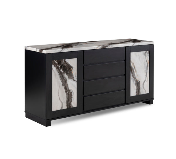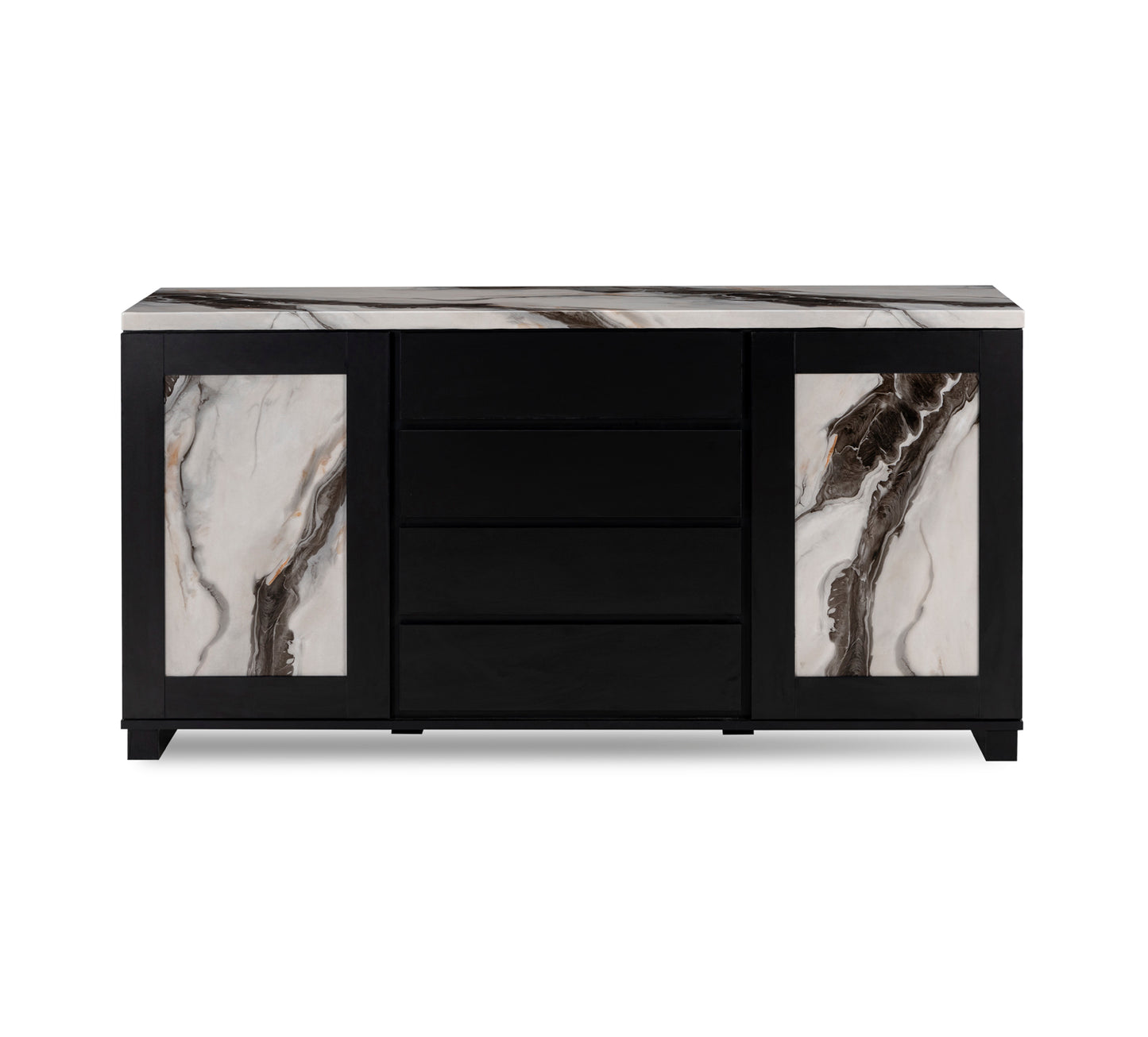 Elevate your dining space with this modern, elegant buffet featuring a stunning faux marble top and matching doors. The sleek black base, crafted from durable Rubberwood solids, provides a strong foundation while adding a touch of sophistication. Behind each set of doors, you'll find open shelving that offers convenient storage and display options, perfectly blending luxury with everyday functionality.
