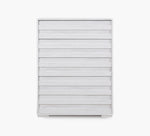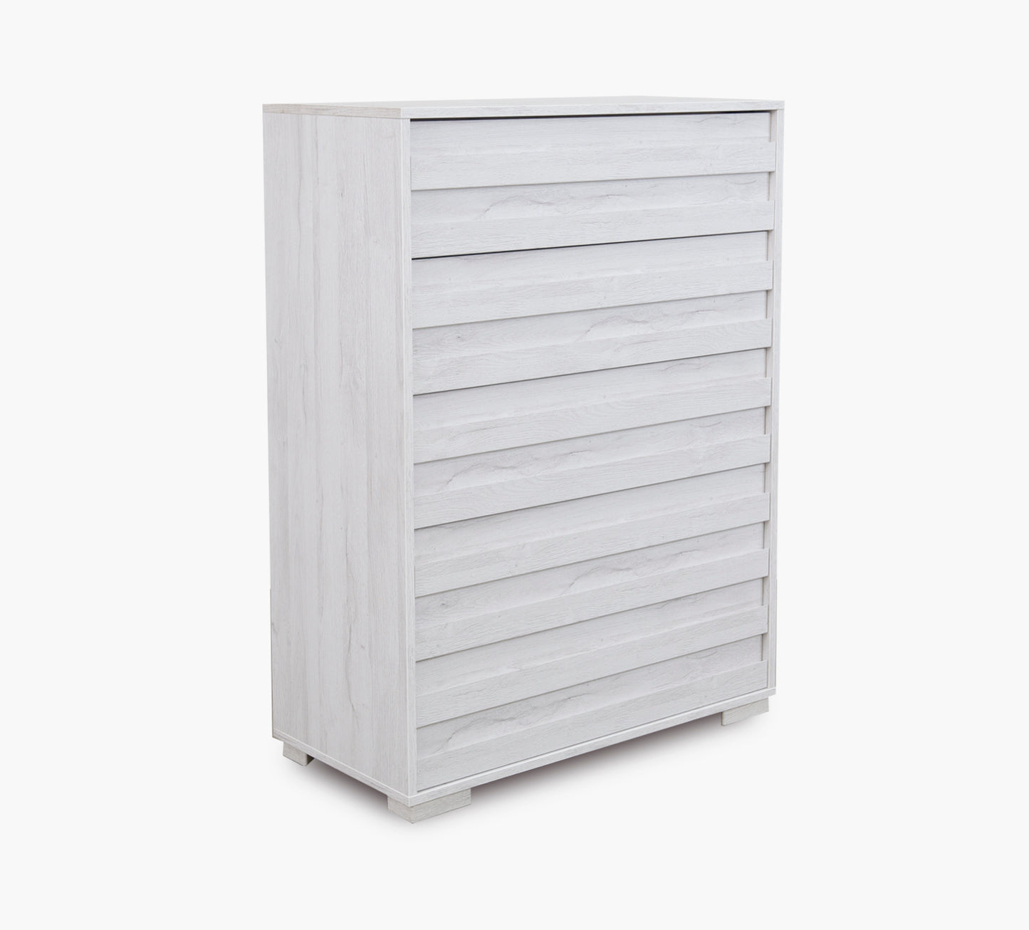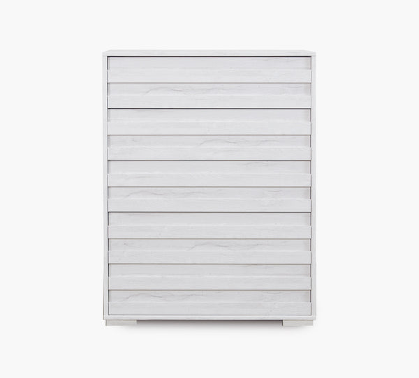 A stylish chest finished in white oak with wood grain texture for a natural, welcoming look. Slatted drawer fronts add a touch of character, while five spacious drawers provide plenty of storage. Designed with full-extension self-closing drawers for smooth functionality and crafted from durable engineered wood for lasting quality.