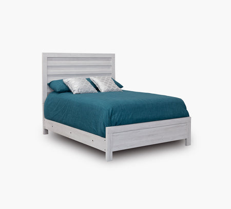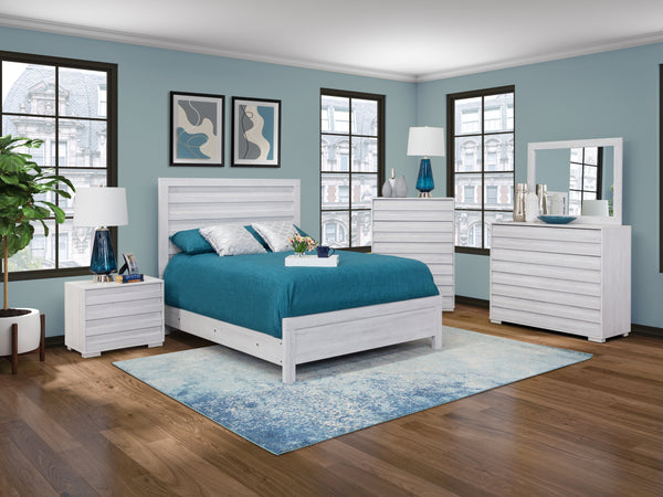 A contemporary bedroom set with clean, modern lines that brings a fresh and inviting feel to your space. The white oak finish with wood grain texture adds a natural touch, while slat detailing throughout enhances the design. Crafted from durable engineered wood, this set includes a three-piece king panel bed, dresser, and mirror. The dresser features four extra-deep drawers with full-extension self-closing guides for smooth functionality. The king bed supports up to 1000 lbs, offering strength and peace of mind along with timeless style.
