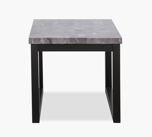 Contemporary and stylish this end table is constructed with a grey faux marble top with a hardwood solid wood base finished in black. Matching dining table also available.