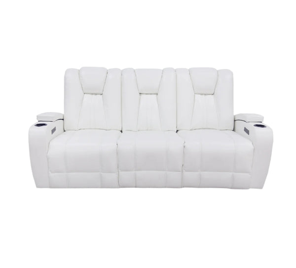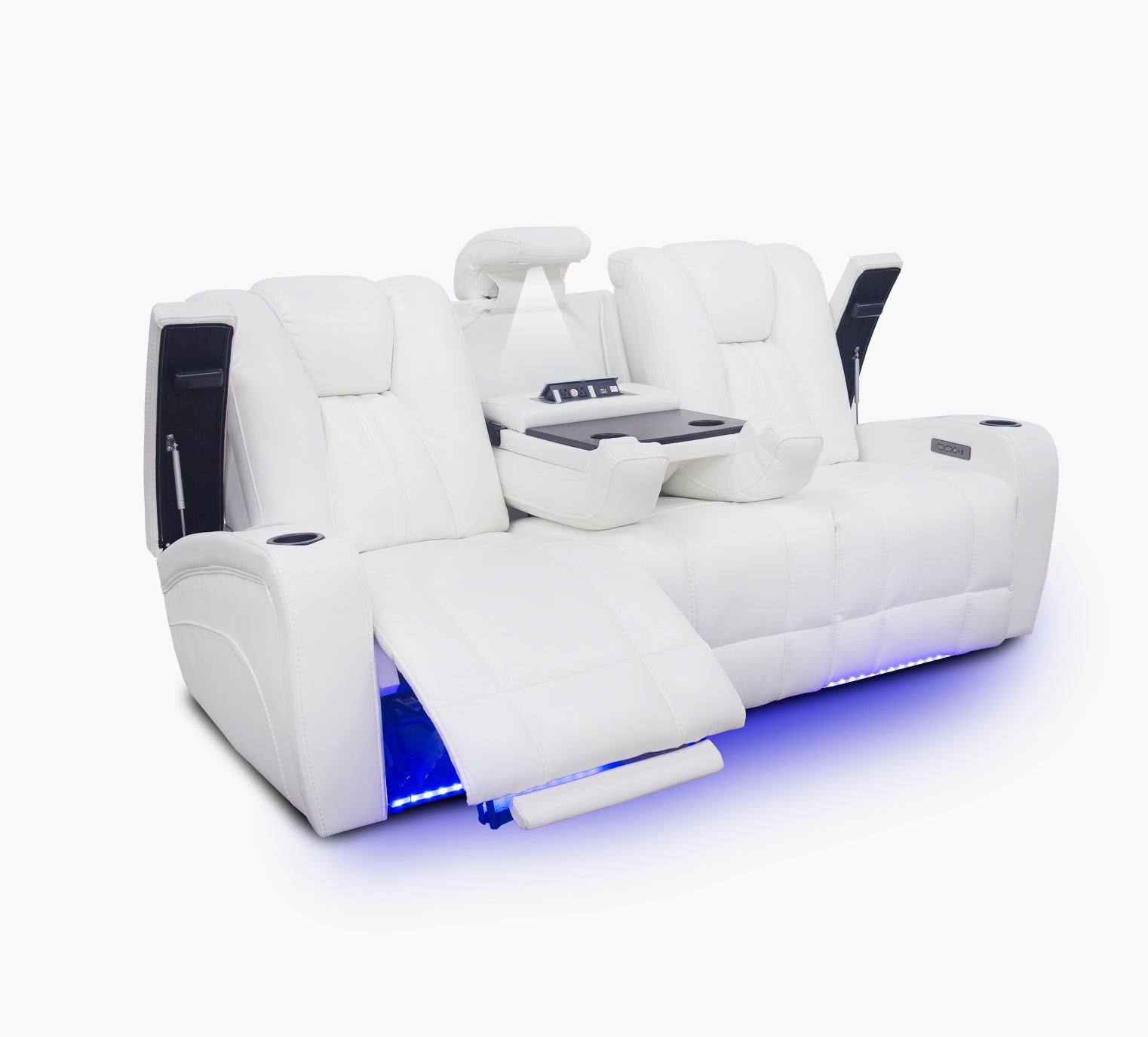 Contemporary design stocked in two colors. Unique zero gravity recline allows for a heart-healthy position headrest gives head support for tv watching. All pieces include lights on the front rail, storage in the arms, and cupholders. Sofa features drop down table with 2 110V & USB charging stations, and light in the top of the drop down.