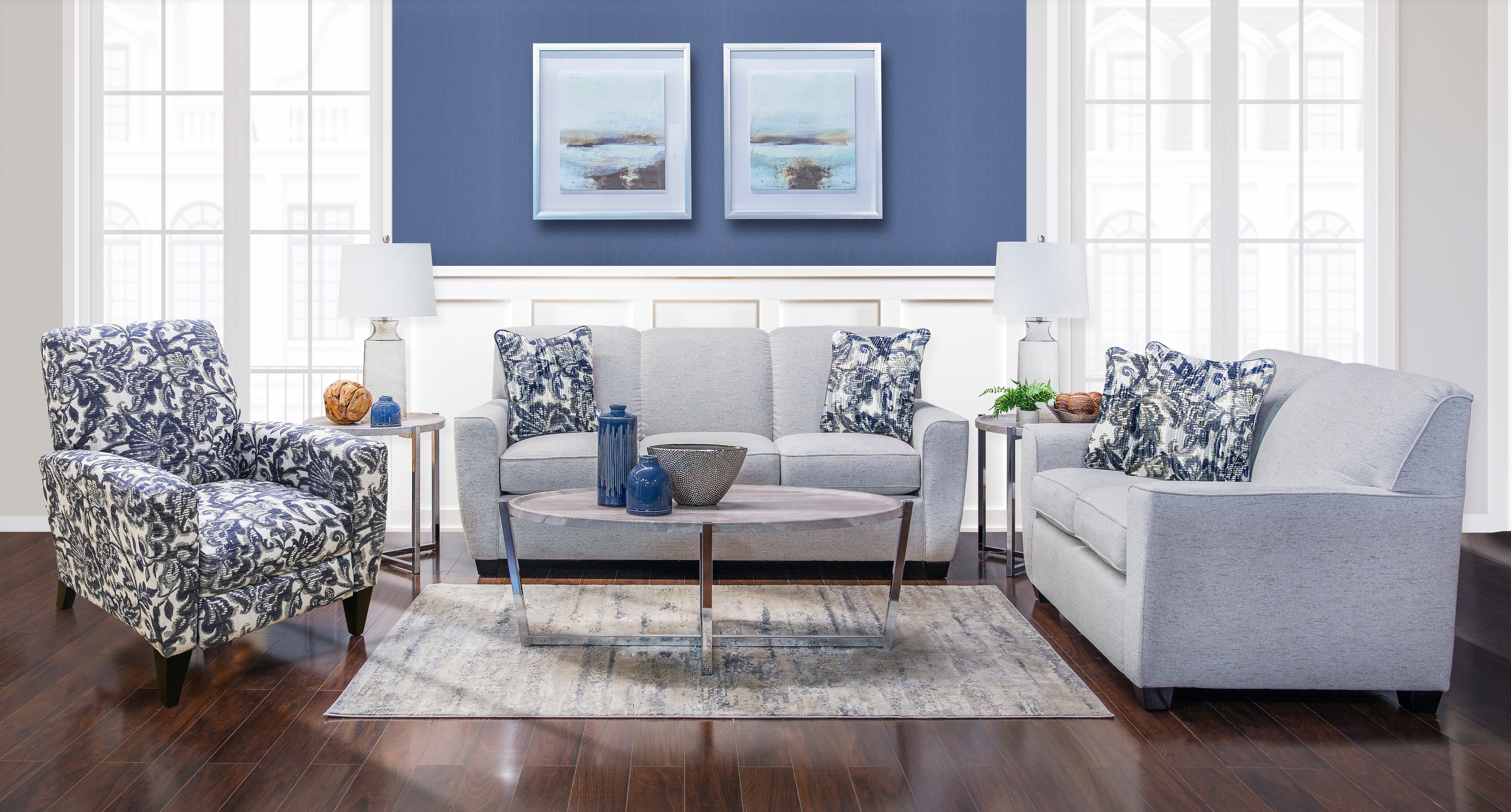 Contemporary three over three style with box welt reversible seats, dome arms, and wood block legs. Sofa and loveseat include 2 throw pillows in correlate pattern. Accent high leg reclining chair also stocked.