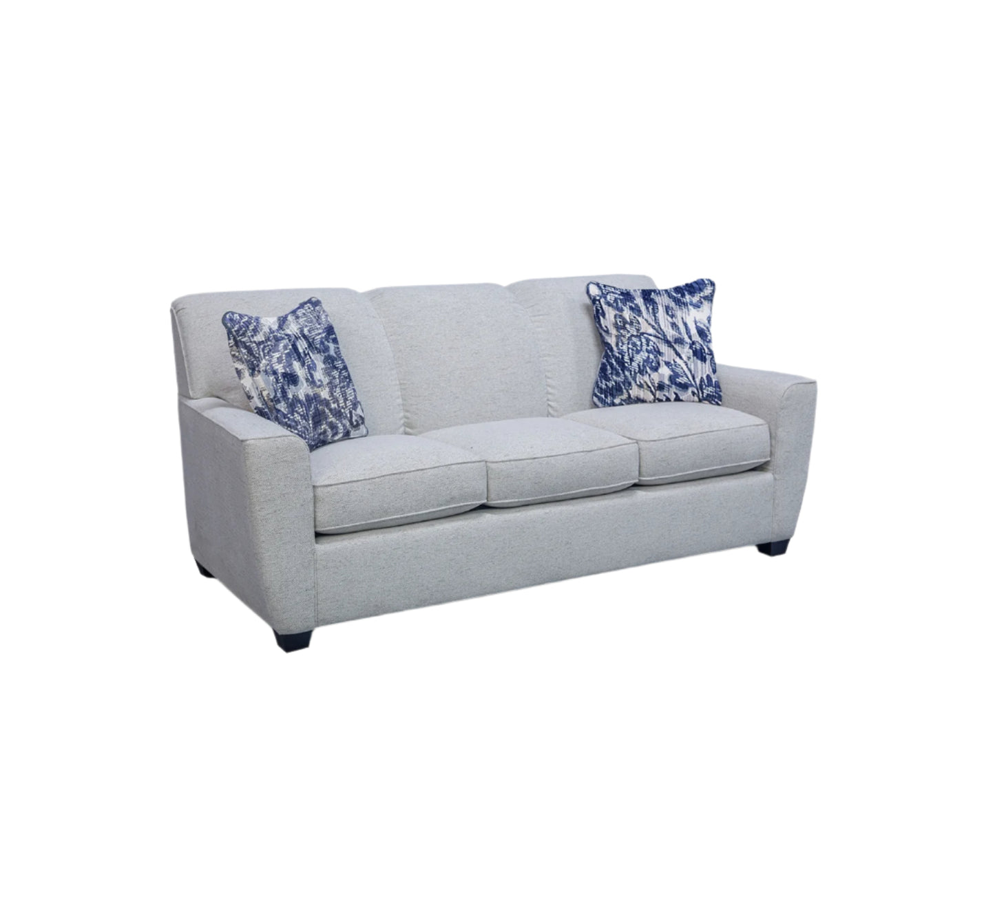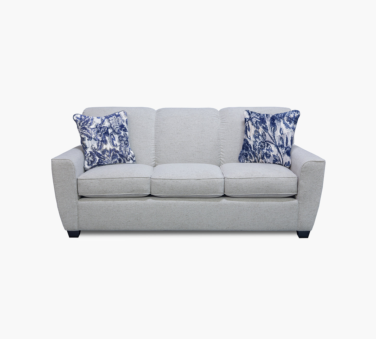 Contemporary three over three style with box welt reversible seats, dome arms, and wood block legs. Include 2 throw pillows in correlate pattern.