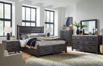 The Plum Creek storage bedroom set combines elegant design with practical functionality. Its washed onyx finish is beautifully enhanced by wire brushing and cerusing techniques, creating a warm and inviting look. Each piece is crafted from durable white oak veneers and accented with genuine granite tops for lasting quality. Burnished bronze hardware and smooth ball bearing side mounted guides ensure effortless use, while felt lined top drawers protect delicate items. The queen storage bed is built to support up to 550 lbs, offering strength and style with added storage convenience.