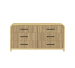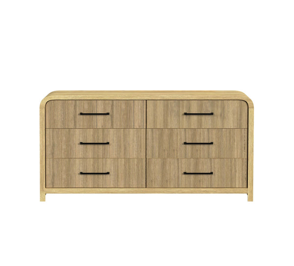 The Ridgemont collection brings a sense of relaxed sophistication to your bedroom with its natural wood finish and thoughtfully crafted details. The 62 inch dresser offers generous storage with six smooth-gliding drawers, accented by ribbed paneling and sleek black metal hardware for a modern touch. Rounded edges and felt-lined top drawers add a layer of refinement and care for your essentials.