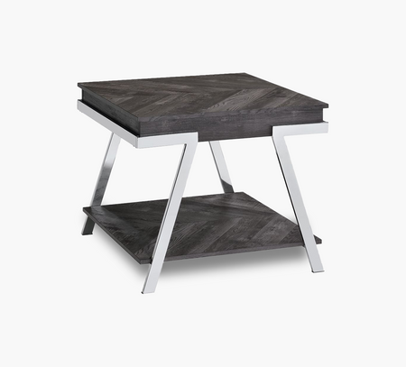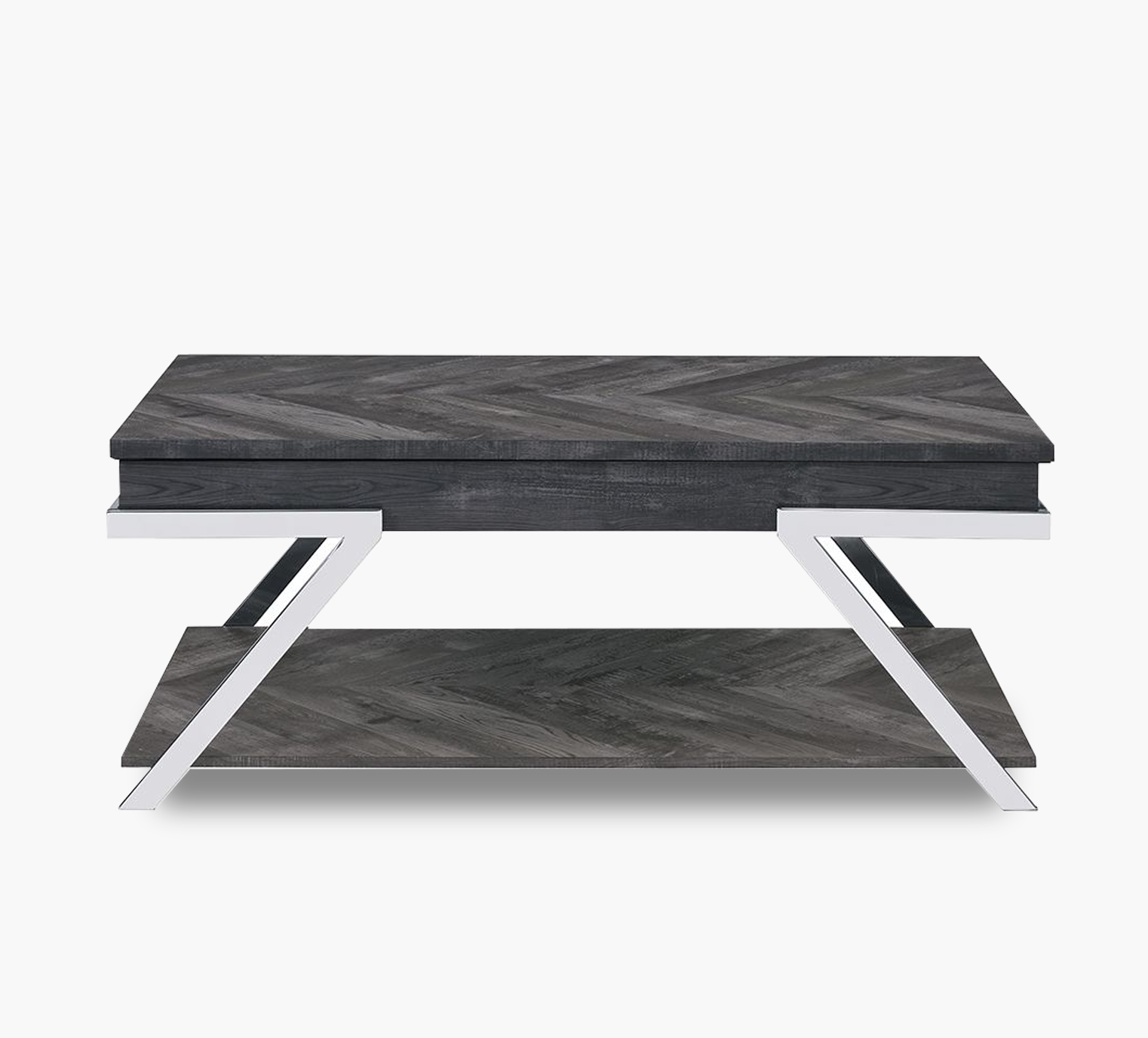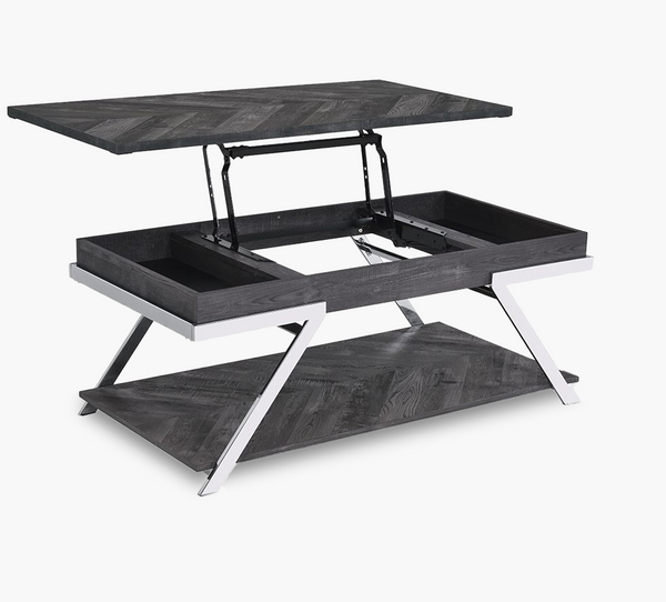 Faux wood lift top cocktail table with chrome legs offers under top storage for devices or remotes.Bottom shelf for added storage or display.