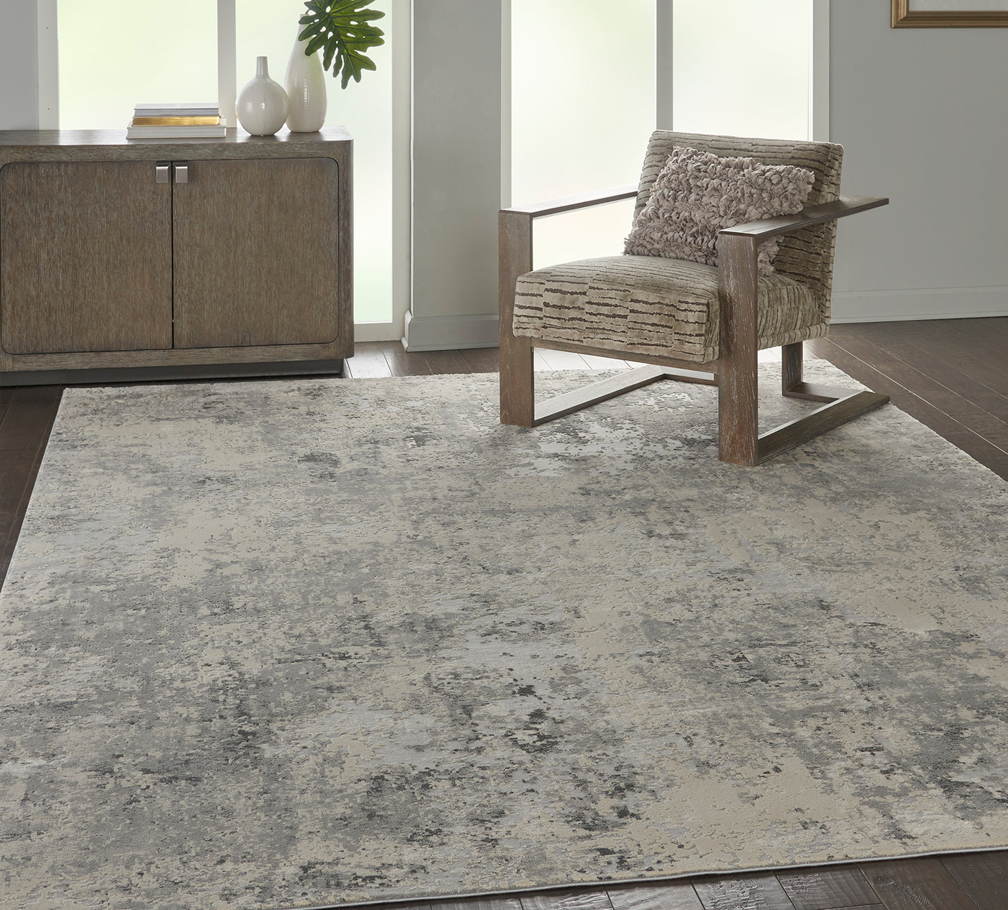 Abstract tones and carved distress patterns bring a textured elegance and modern chic to this Rustic Textures Collection rug. Charcoal and grey splashes on an ivory field of soft, easy-care fibers brings a modern artistic air to any interior decor.