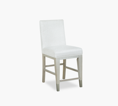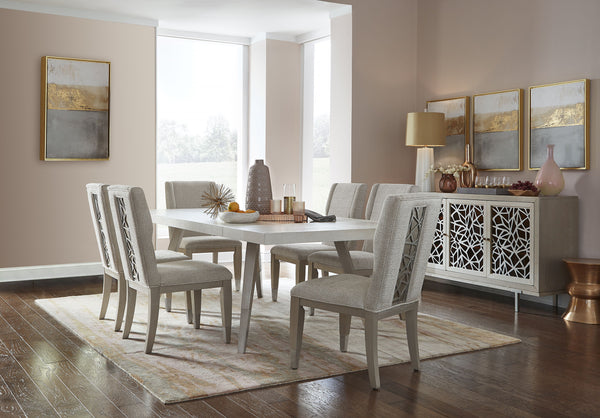The Ryker Champagne 5 Piece Rectangular Dining Set offers contemporary dining with a stunning mix of wood, metal, and glass. Crafted of Cathedral White Oak veneers, hardwood solids, and veneers in a luxurious champagne finish, the rectangular table features a clear glass insert over silver fretwork in the center for a striking design detail. It extends to 100 inches long with two 12-inch refractory leaves, making it perfect for both intimate meals and larger gatherings. Sleek silver metal caps accent the feet for a refined touch. Completing the set are four elegant side chairs with fully upholstered cream seats and backs, highlighted by silver fretwork inserts and silver metal caps on the front legs. Each chair is upholstered in 100% polyester fabric with a cleaning code of W and supports up to 300 lbs, combining style, comfort, and durability.