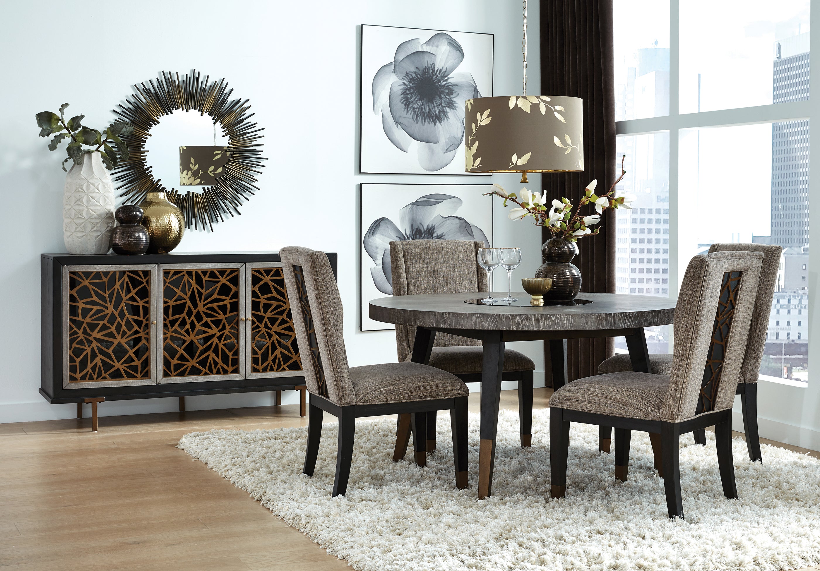 The Ryker Espresso 5 Piece Round Dining Set brings contemporary elegance to your home with a stunning mix of wood, metal, and glass. Crafted of Cathedral White Oak veneers, hardwood solids, and veneers in a rich tan and espresso finish, the round table features a black mirror lazy Susan in the center for effortless serving and a bold design statement. Aged brass metal caps accent the feet for a refined touch. Completing the set are four upholstered side chairs with tan seats and backs, accented by brass-tone fretwork inserts over black upholstery and aged brass metal caps on the front legs. Each chair is upholstered in 100% polyester with a cleaning code of W and supports up to 300 lbs, combining style, comfort, and durability.