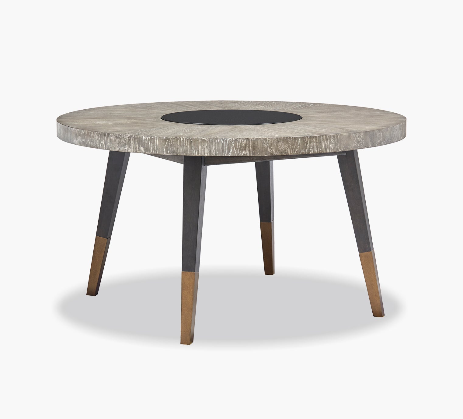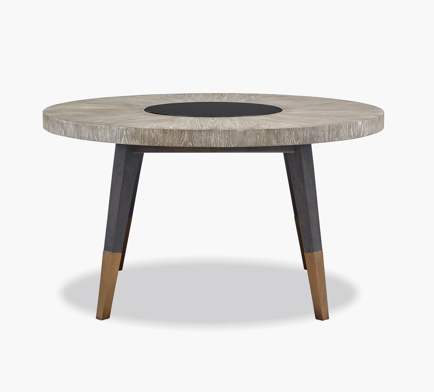 The Ryker Espresso Round Dining Table brings contemporary style to your home with a stunning mix of wood, metal, and glass. Crafted of Cathedral White Oak veneers, hardwood solids, and veneers in a rich tan and espresso finish, this elegant table features a black mirror lazy Susan in the center for effortless serving and a bold design statement. Sleek aged brass metal caps accent the feet, adding a refined touch to its modern silhouette. Perfect for intimate dining and stylish entertaining, this table combines beauty and functionality for a sophisticated centerpiece.